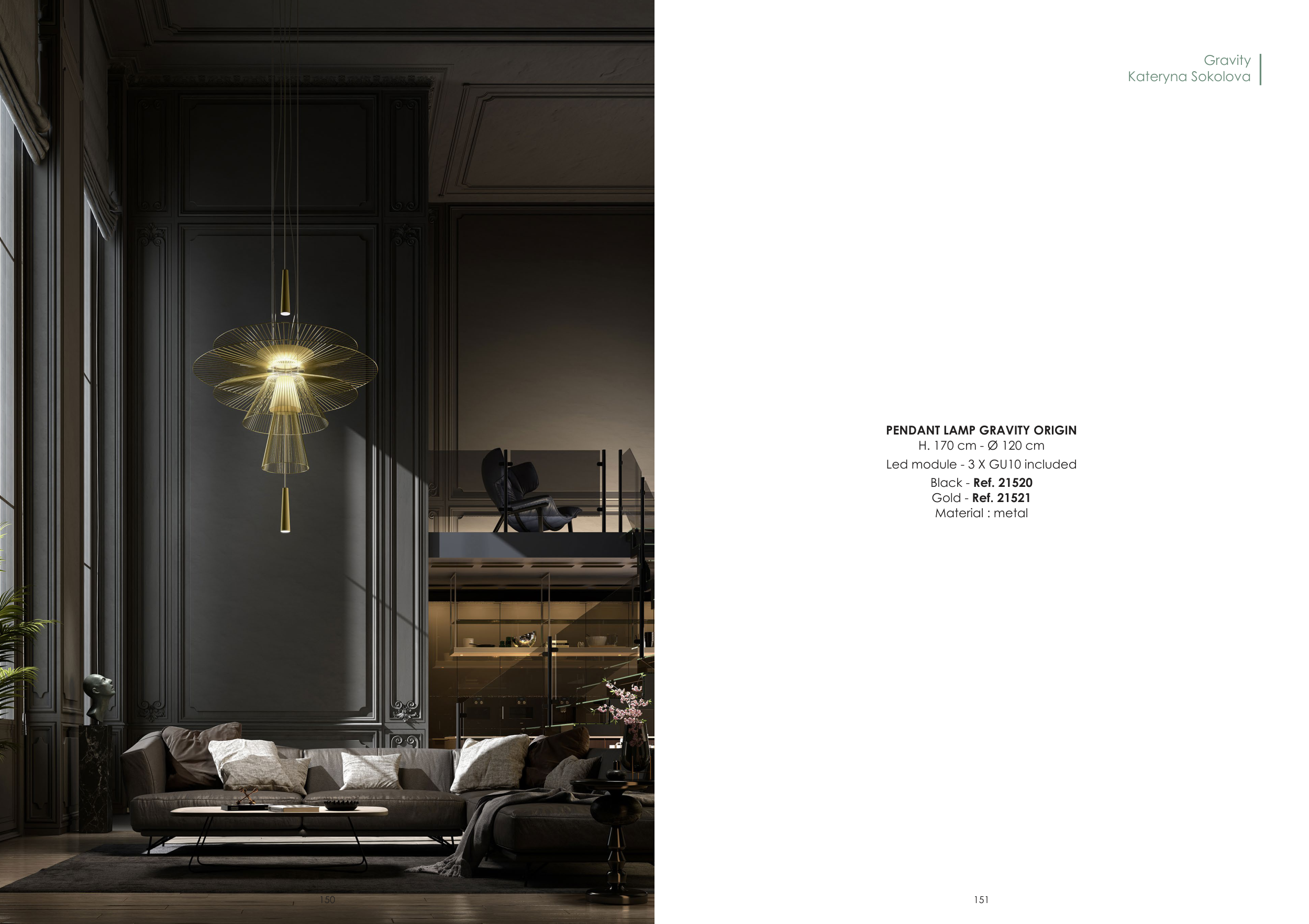 Gravity Kateryna Sokolova PENDANT LAMP GRAVITY ORIGIN H. 170 cm - Ø 120 cm Led module - 3 X GU10 included Black - Ref. 21520 Gold - Ref. 21521 Material : metal 150 151