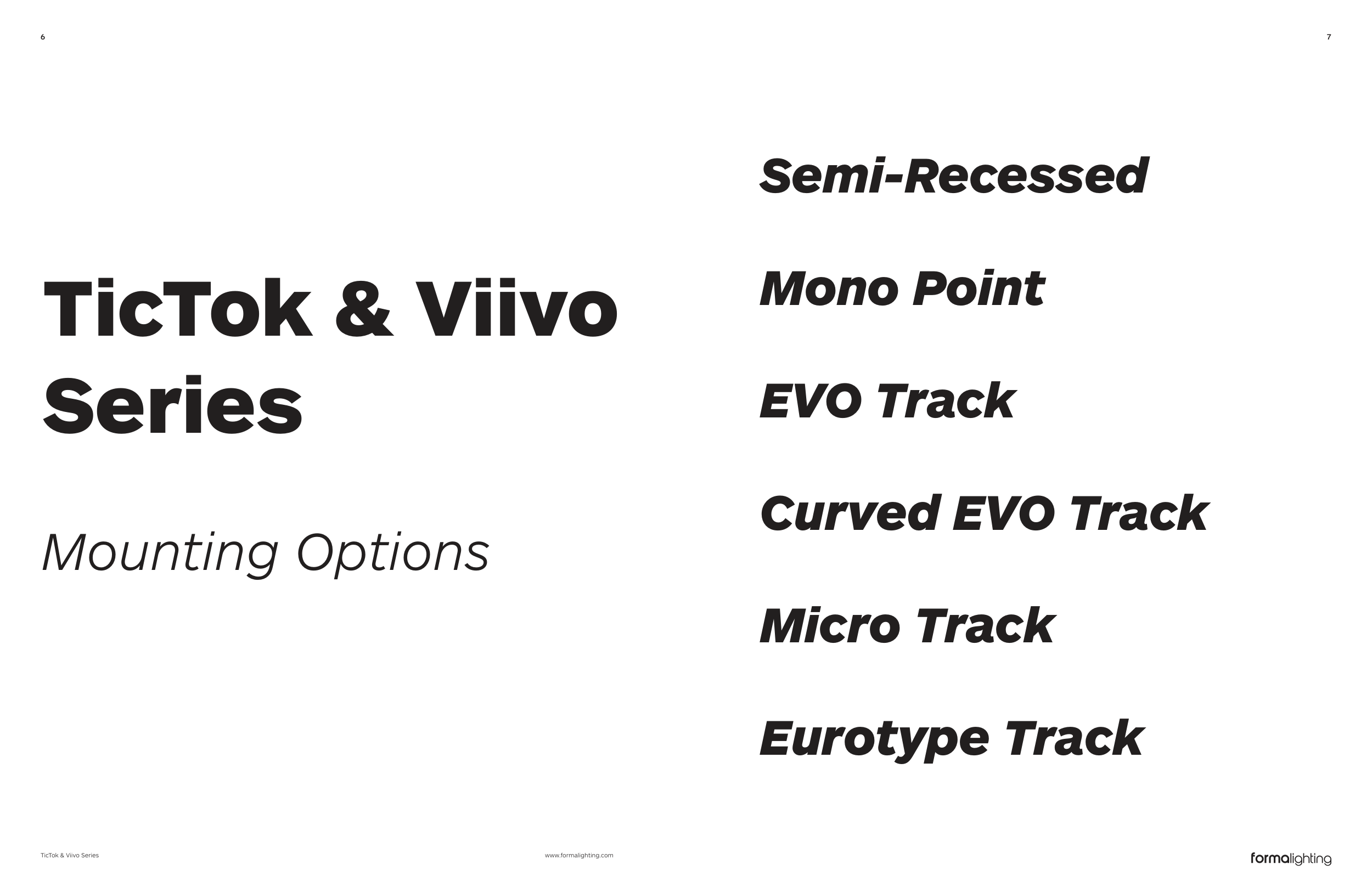 www.formalighting.com 6 7 TicTok & Viivo Series Semi-Recessed Mono Point EVO Track Curved EVO Track Micro Track Eurotype Track TicTok & Viivo Series Mounting Options