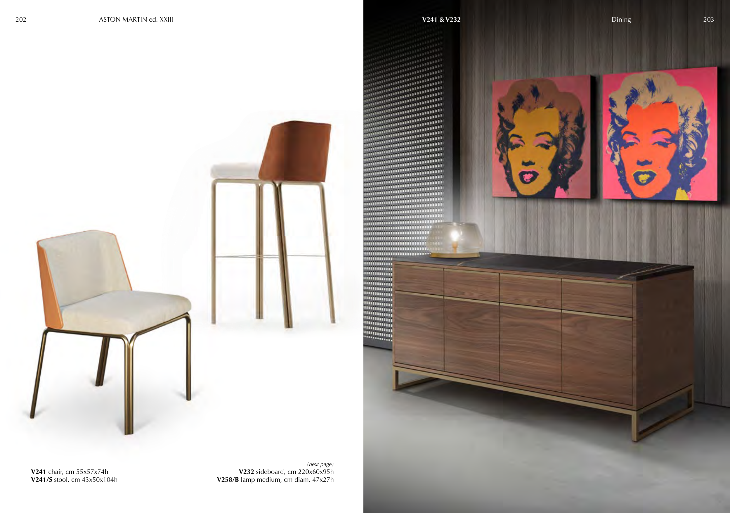 V241 & V232 V241 chair, cm 55x57x74h V241/S stool, cm 43x50x104h (next page) V232 sideboard, cm 220x60x95h V258/B lamp medium, cm diam. 47x27h 202 ASTON MARTIN ed. XXIII 203 Dining