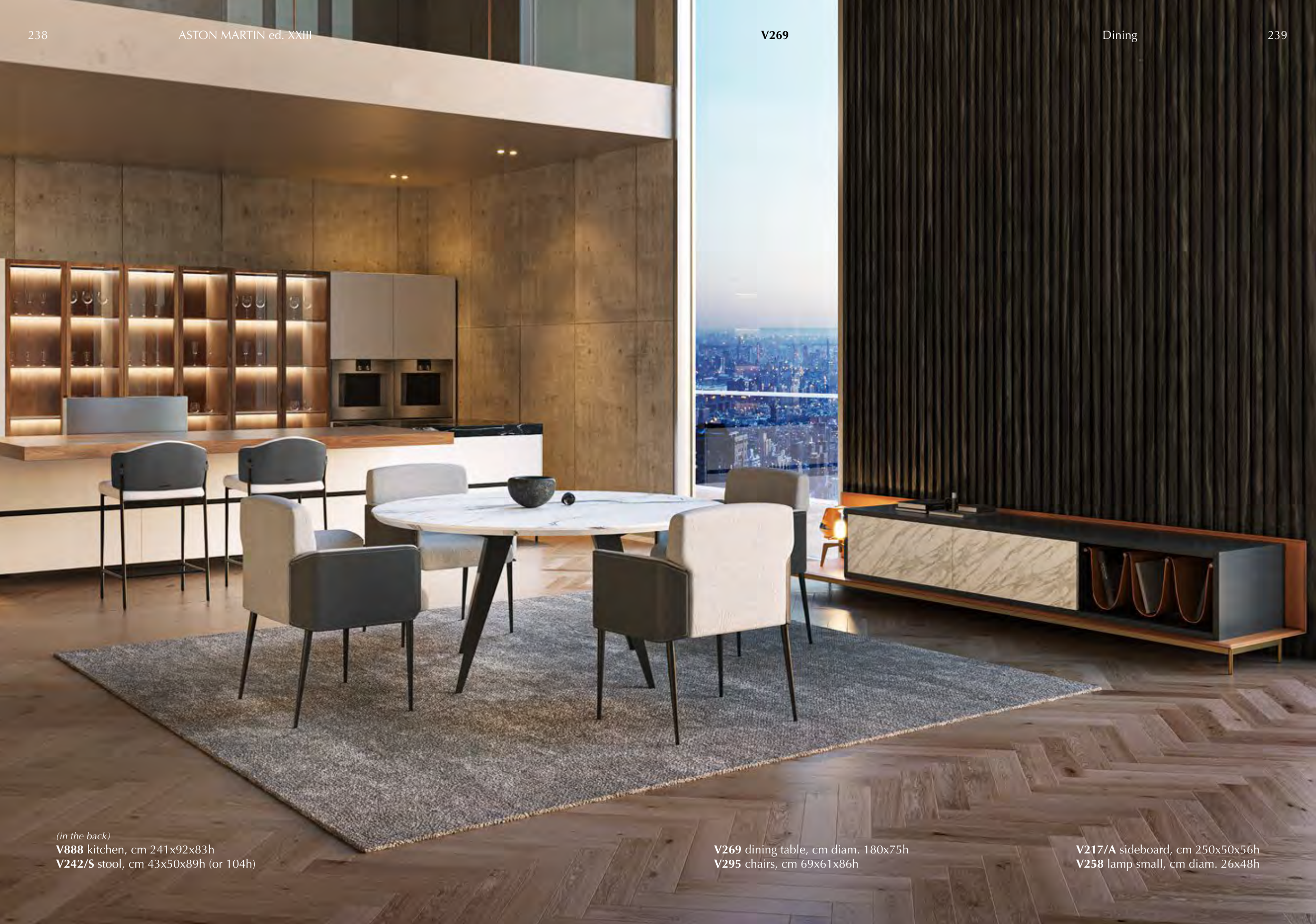 (in the back) V888 kitchen, cm 241x92x83h V242/S stool, cm 43x50x89h (or 104h) V217/A sideboard, cm 250x50x56h V258 lamp small, cm diam. 26x48h V269 dining table, cm diam. 180x75h V295 chairs, cm 69x61x86h V269 238 ASTON MARTIN ed. XXIII 239 Dining