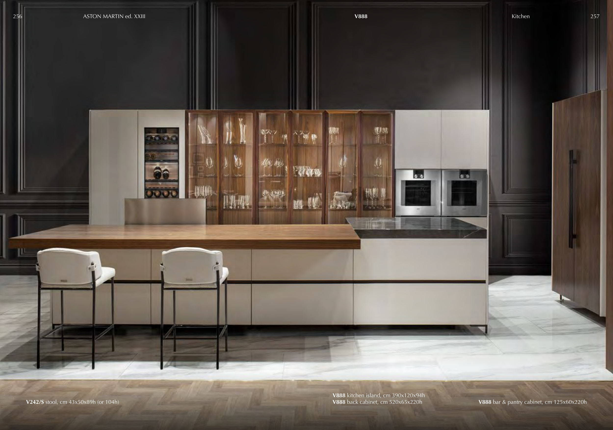 V242/S stool, cm 43x50x89h (or 104h) V888 kitchen island, cm 390x120x94h V888 back cabinet, cm 520x65x220h V888 bar & pantry cabinet, cm 125x60x220h V888 256 ASTON MARTIN ed. XXIII 257 Kitchen