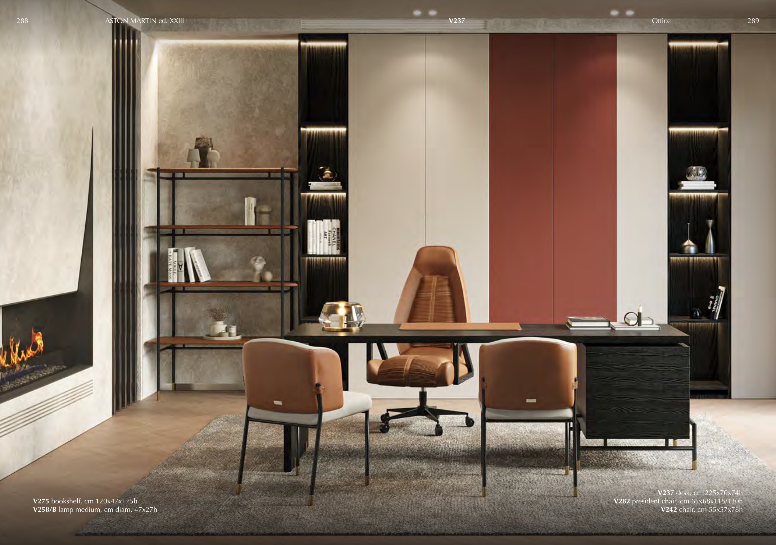 V275 bookshelf, cm 120x47x175h V258/B lamp medium, cm diam. 47x27h V237 desk, cm 225x70x74h V282 president chair, cm 65x68x115/130h V242 chair, cm 55x57x78h V237 288 ASTON MARTIN ed. XXIII 289 Office