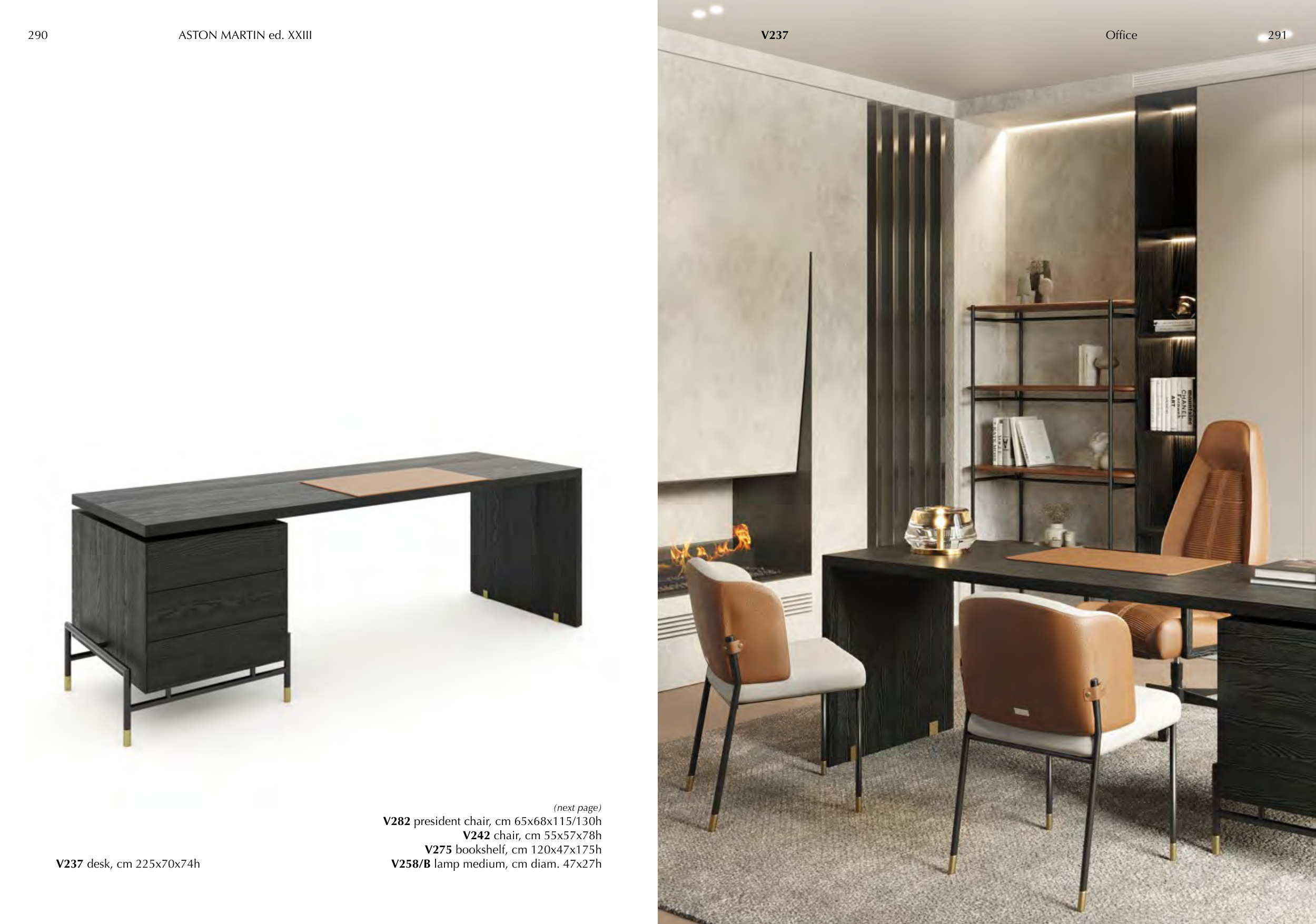 V237 (next page) V282 president chair, cm 65x68x115/130h V242 chair, cm 55x57x78h V275 bookshelf, cm 120x47x175h V258/B lamp medium, cm diam. 47x27h V237 desk, cm 225x70x74h 290 291 ASTON MARTIN ed. XXIII Office