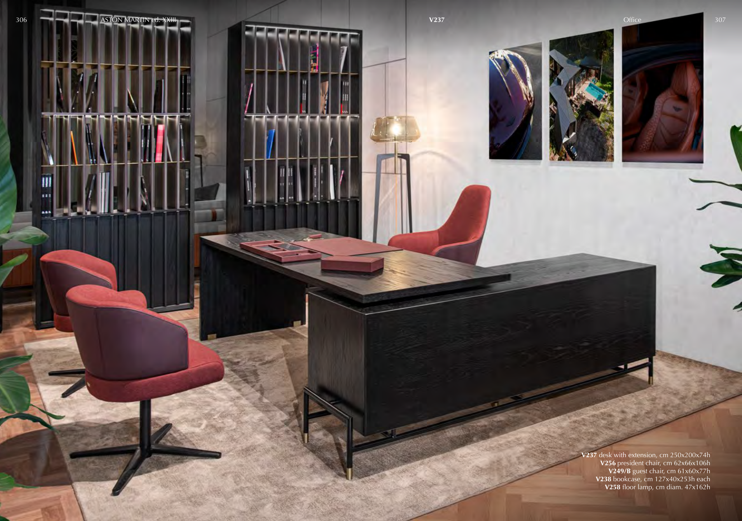 V237 V237 desk with extension, cm 250x200x74h V256 president chair, cm 62x66x106h V249/B guest chair, cm 61x60x77h V238 bookcase, cm 127x40x253h each V258 floor lamp, cm diam. 47x162h 306 ASTON MARTIN ed. XXIII 307 Office