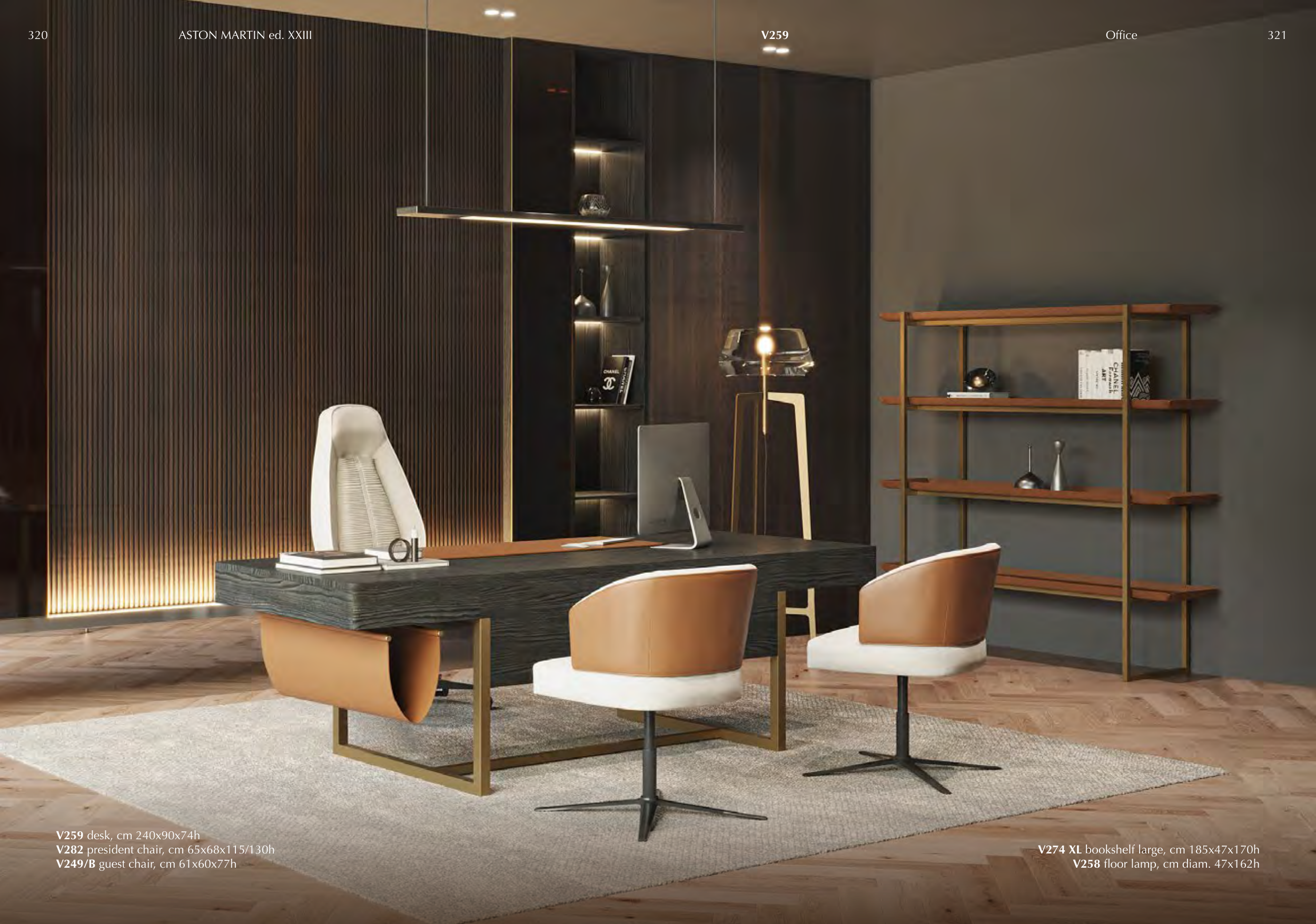 V259 desk, cm 240x90x74h V282 president chair, cm 65x68x115/130h V249/B guest chair, cm 61x60x77h V274 XL bookshelf large, cm 185x47x170h V258 floor lamp, cm diam. 47x162h V259 320 ASTON MARTIN ed. XXIII 321 Office