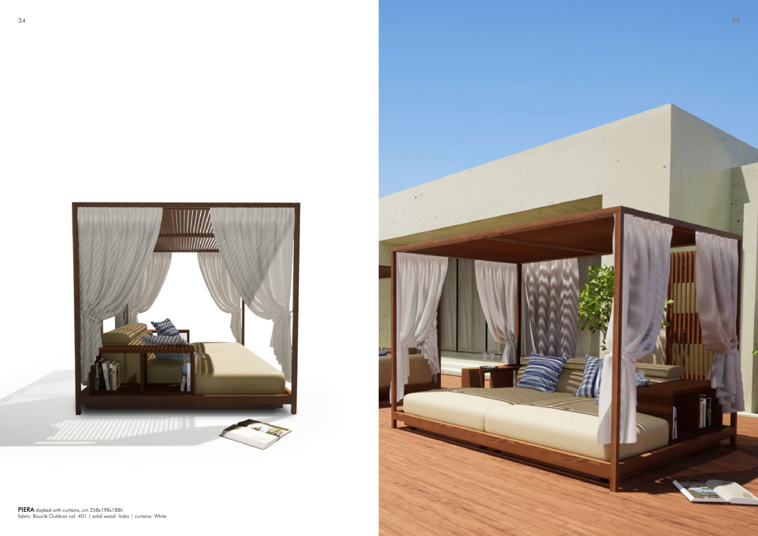 fabric: Bouclé Outdoor col. 401 | solid wood: Iroko | curtains: White
