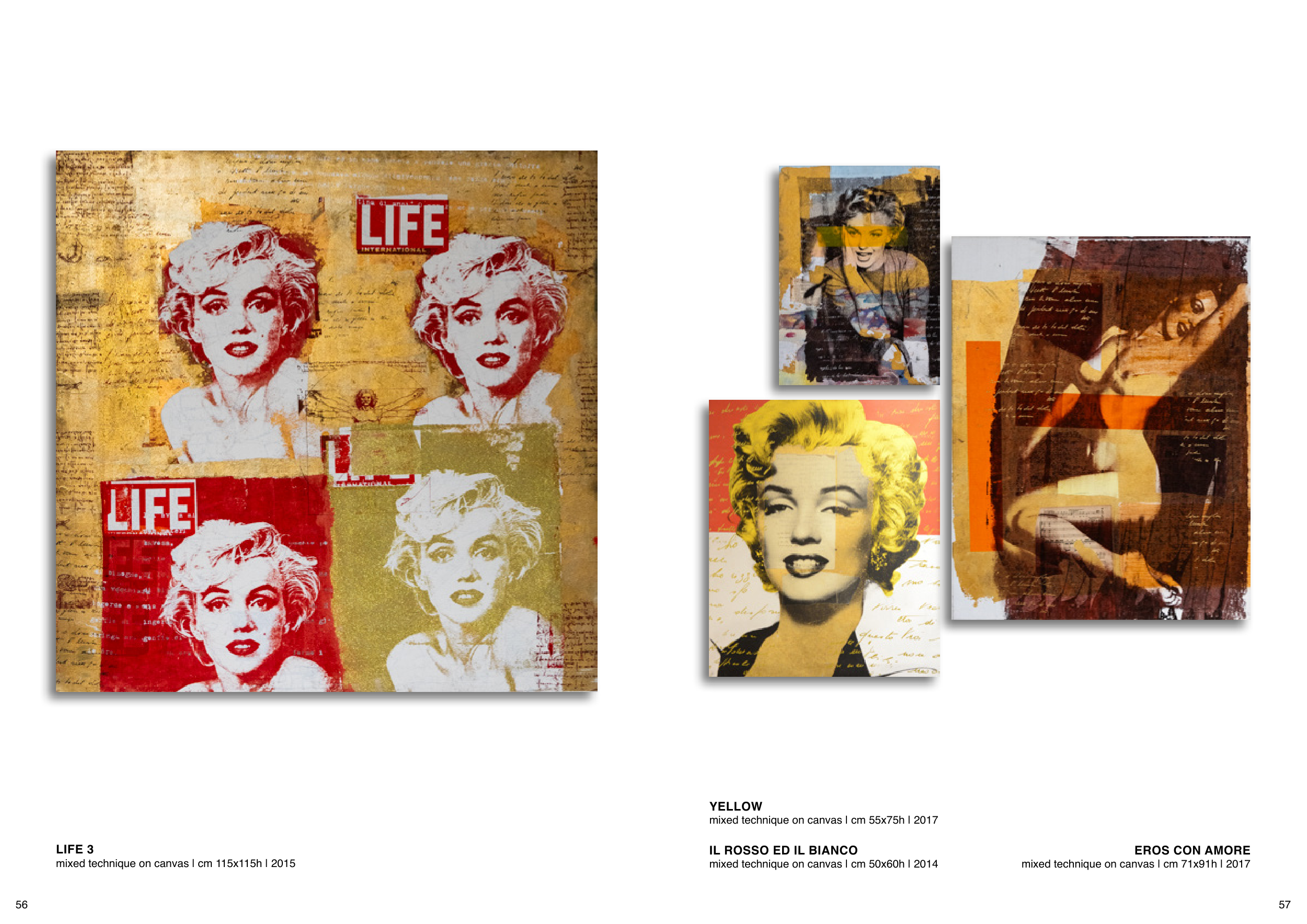EROS CON AMORE mixed technique on canvas | cm 71x91h | 2017 LIFE 3 mixed technique on canvas | cm 115x115h | 2015 YELLOW mixed technique on canvas | cm 55x75h | 2017 IL ROSSO ED IL BIANCO mixed technique on canvas | cm 50x60h | 2014 56 57