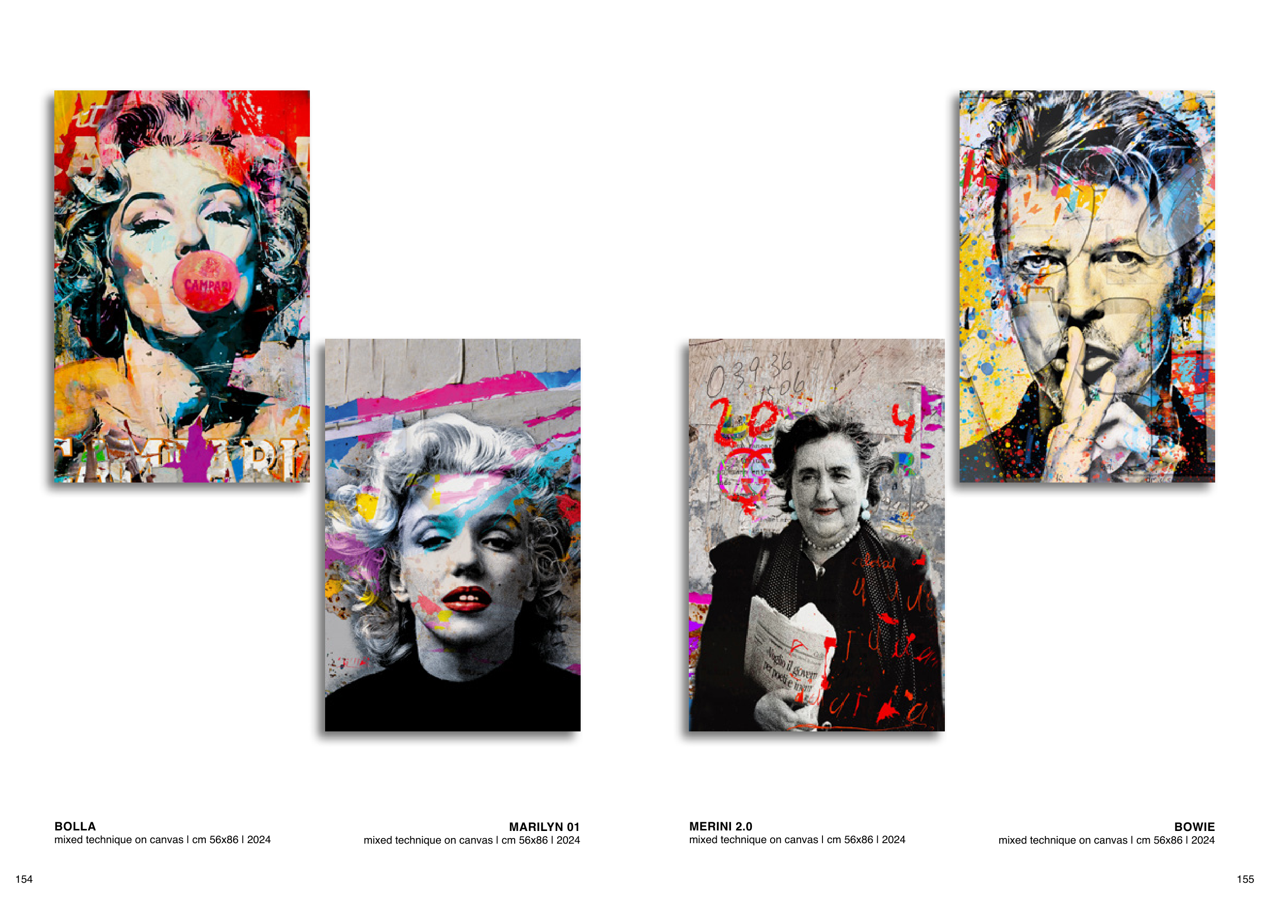 MARILYN 01 mixed technique on canvas | cm 56x86 | 2024 BOWIE mixed technique on canvas | cm 56x86 | 2024 BOLLA mixed technique on canvas | cm 56x86 | 2024 MERINI 2.0 mixed technique on canvas | cm 56x86 | 2024 154 155