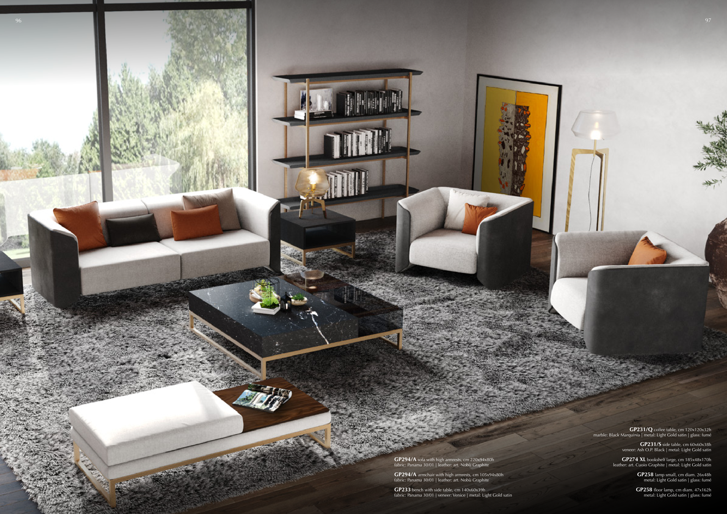 marble: Black Marquinia | metal: Light Gold satin | glass: fumé