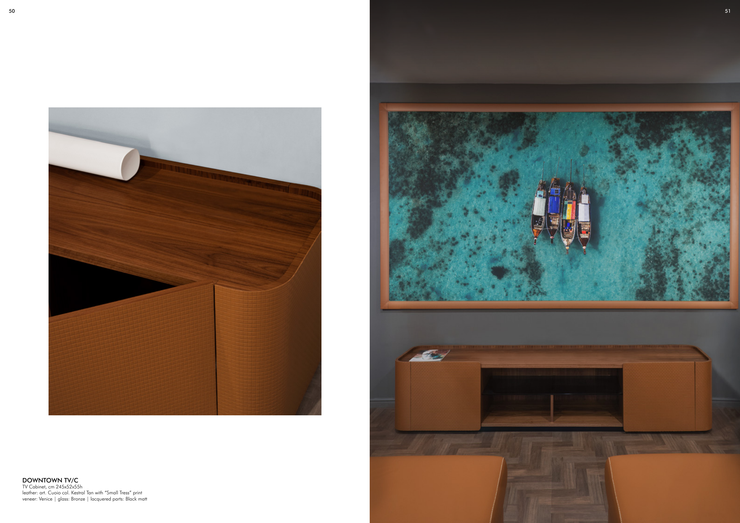 51 50 DOWNTOWN TV/C TV Cabinet, cm 245x52x55h leather: art. Cuoio col. Kestral Tan with “Small Tress” print veneer: Venice | glass: Bronze | lacquered parts: Black matt
