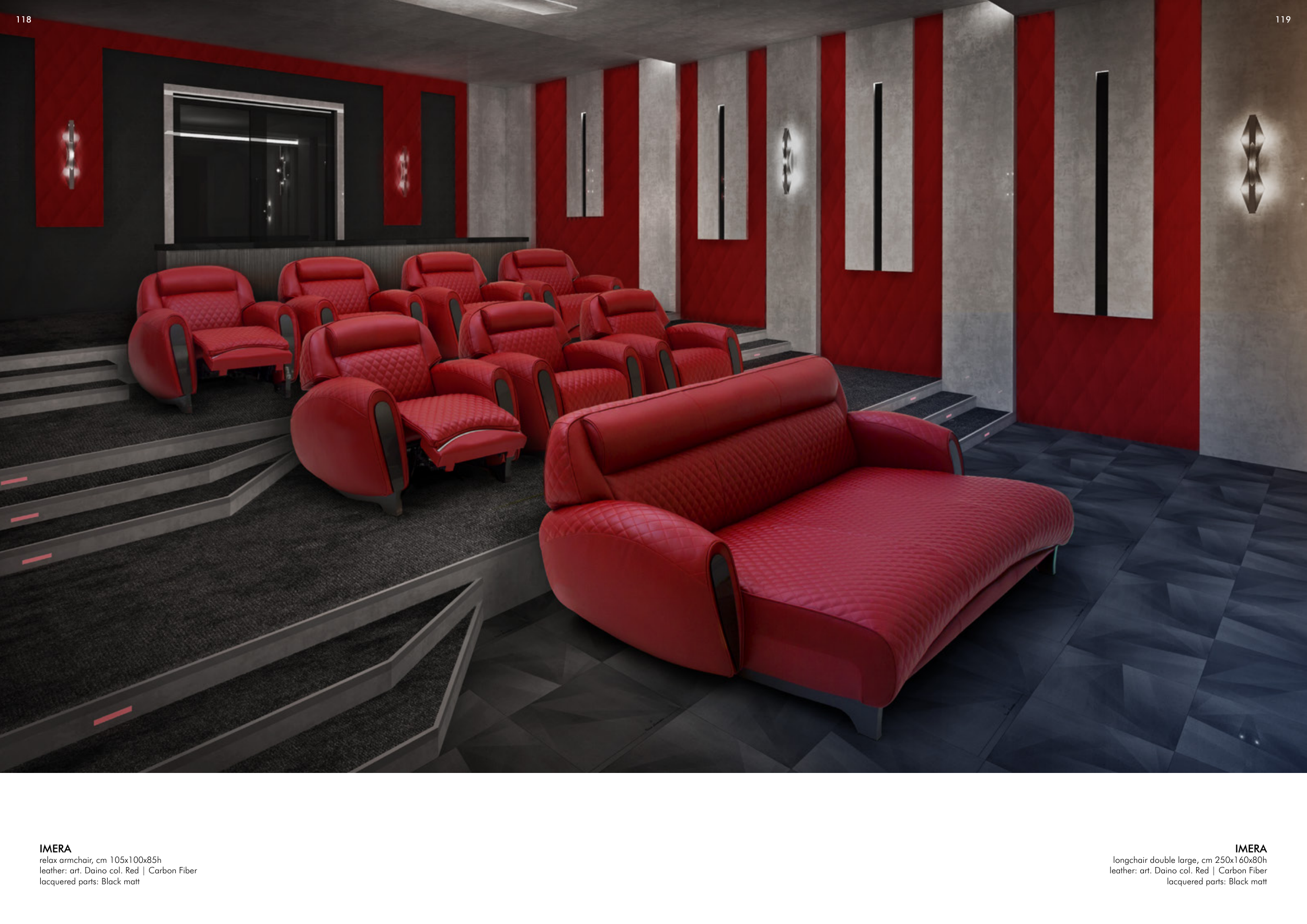 118 119 IMERA relax armchair, cm 105x100x85h leather: art. Daino col. Red | Carbon Fiber lacquered parts: Black matt IMERA longchair double large, cm 250x160x80h leather: art. Daino col. Red | Carbon Fiber lacquered parts: Black matt