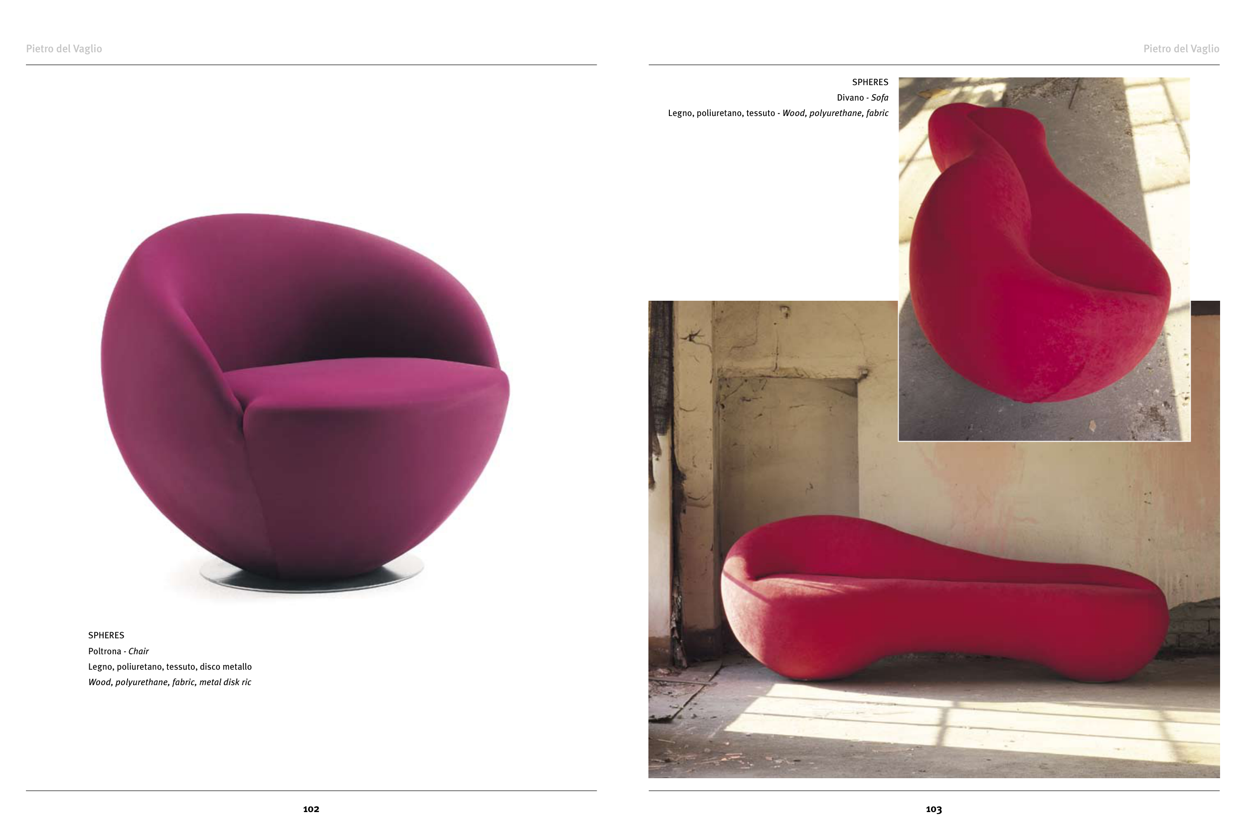 Pietro del Vaglio SPHERES Divano - Sofa Legno, poliuretano, tessuto - Wood, polyurethane, fabric Pietro del Vaglio SPHERES Poltrona - Chair Legno, poliuretano, tessuto, disco metallo Wood, polyurethane, fabric, metal disk ric 102 103