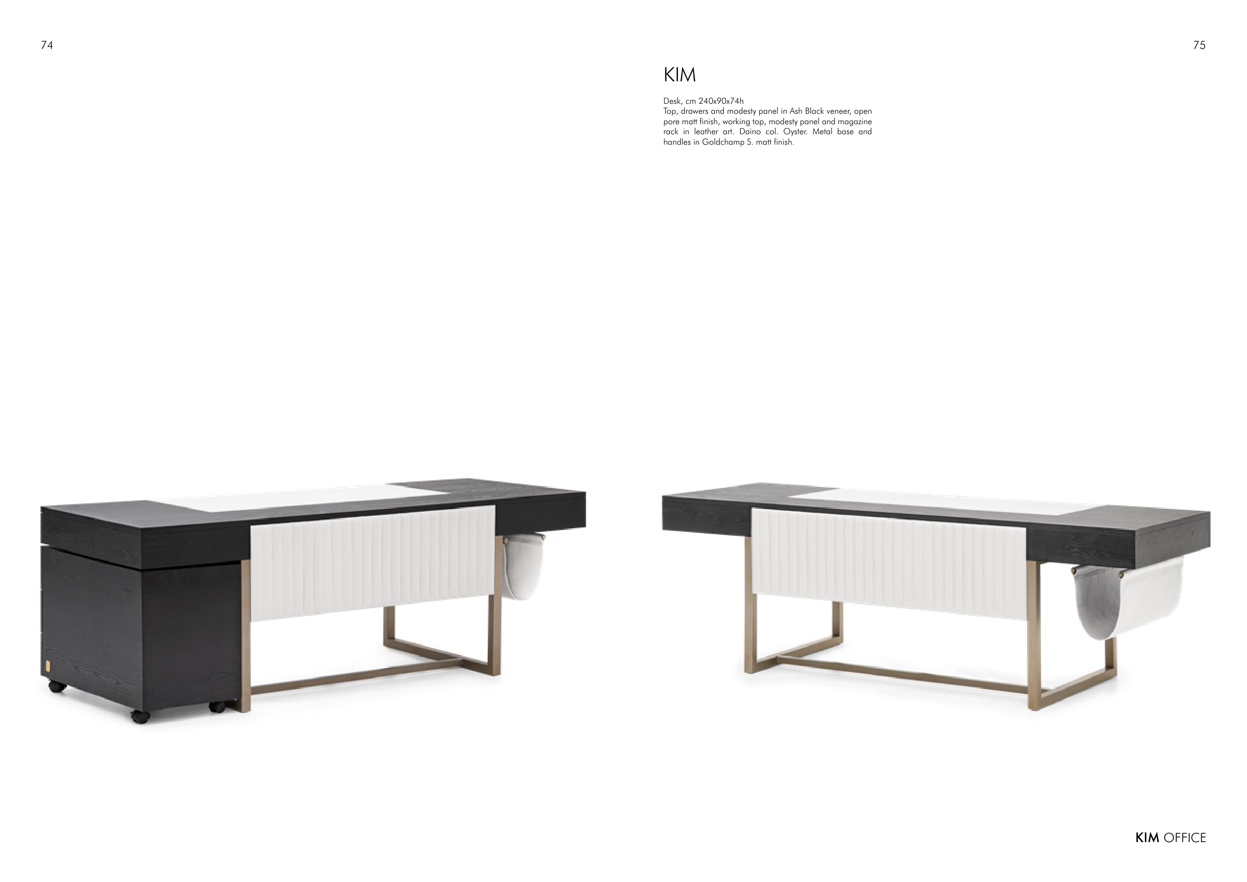 KIM Desk, cm 240x90x74h Top, drawers and modesty panel in Ash Black veneer, open pore matt finish, working top, modesty panel and magazine rack in leather art. Daino col. Oyster. Metal base and handles in Goldchamp S. matt finish. 74 75 KIM OFFICE