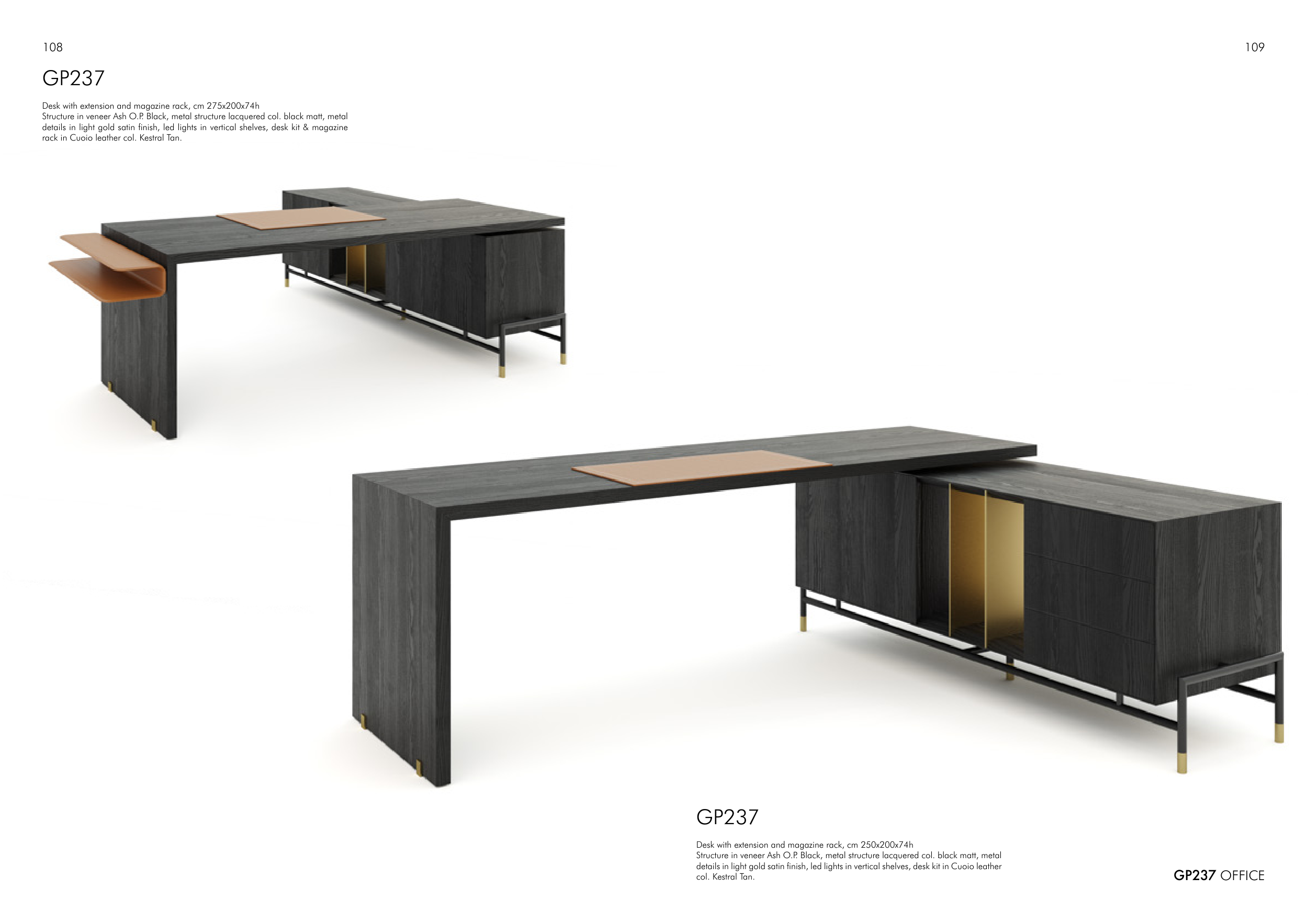 details in light gold satin finish, led lights in vertical shelves, desk kit & magazine