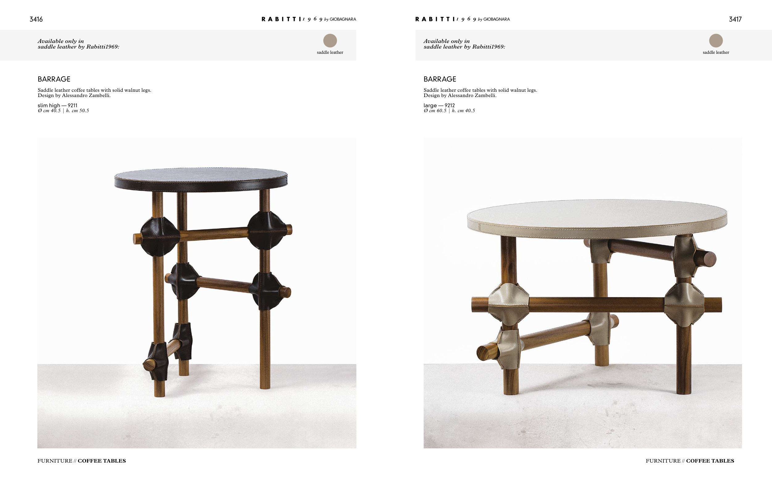 Saddle leather coffee tables with solid walnut legs.