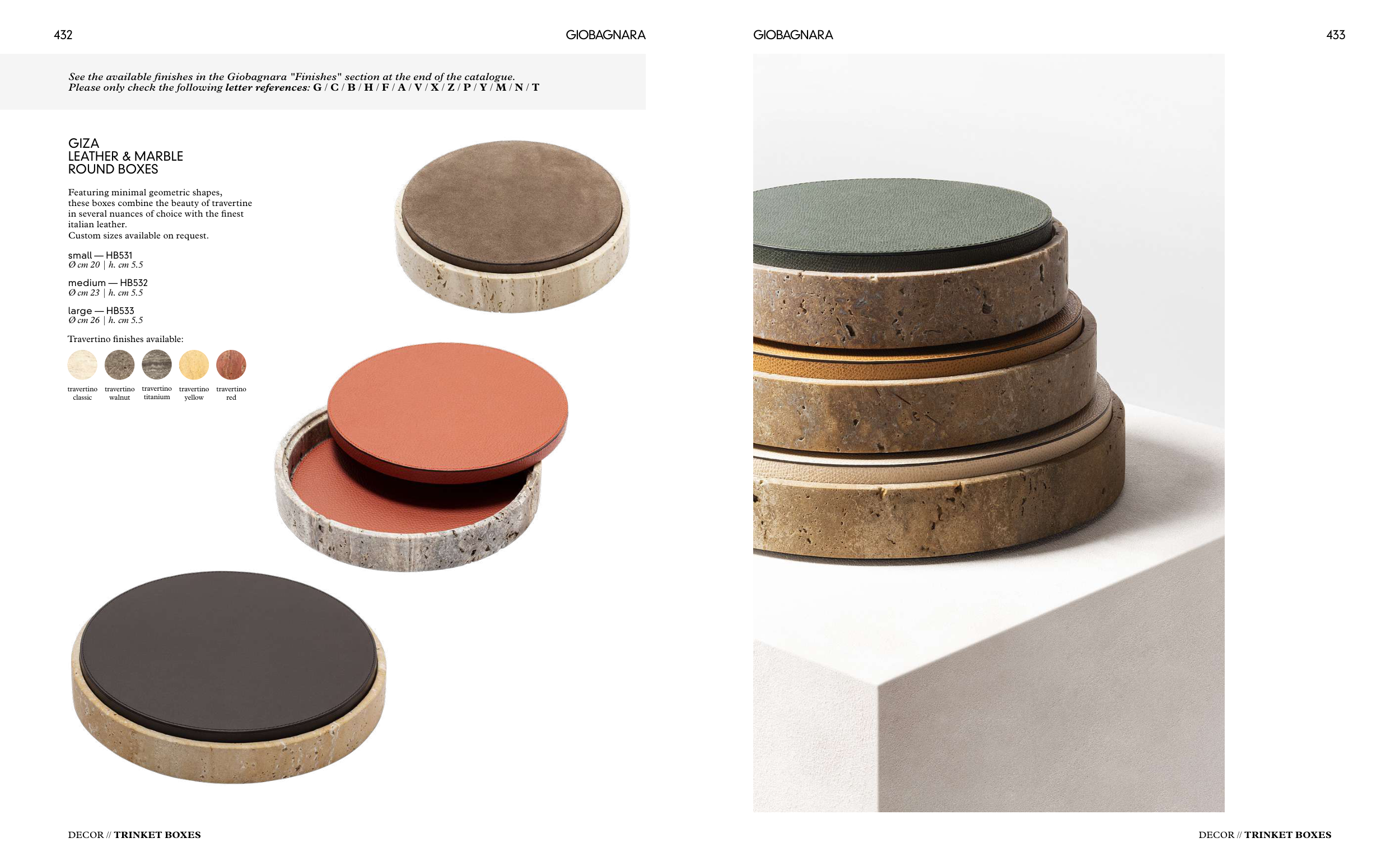 See the available finishes in the Giobagnara "Finishes" section at the end of the catalogue.