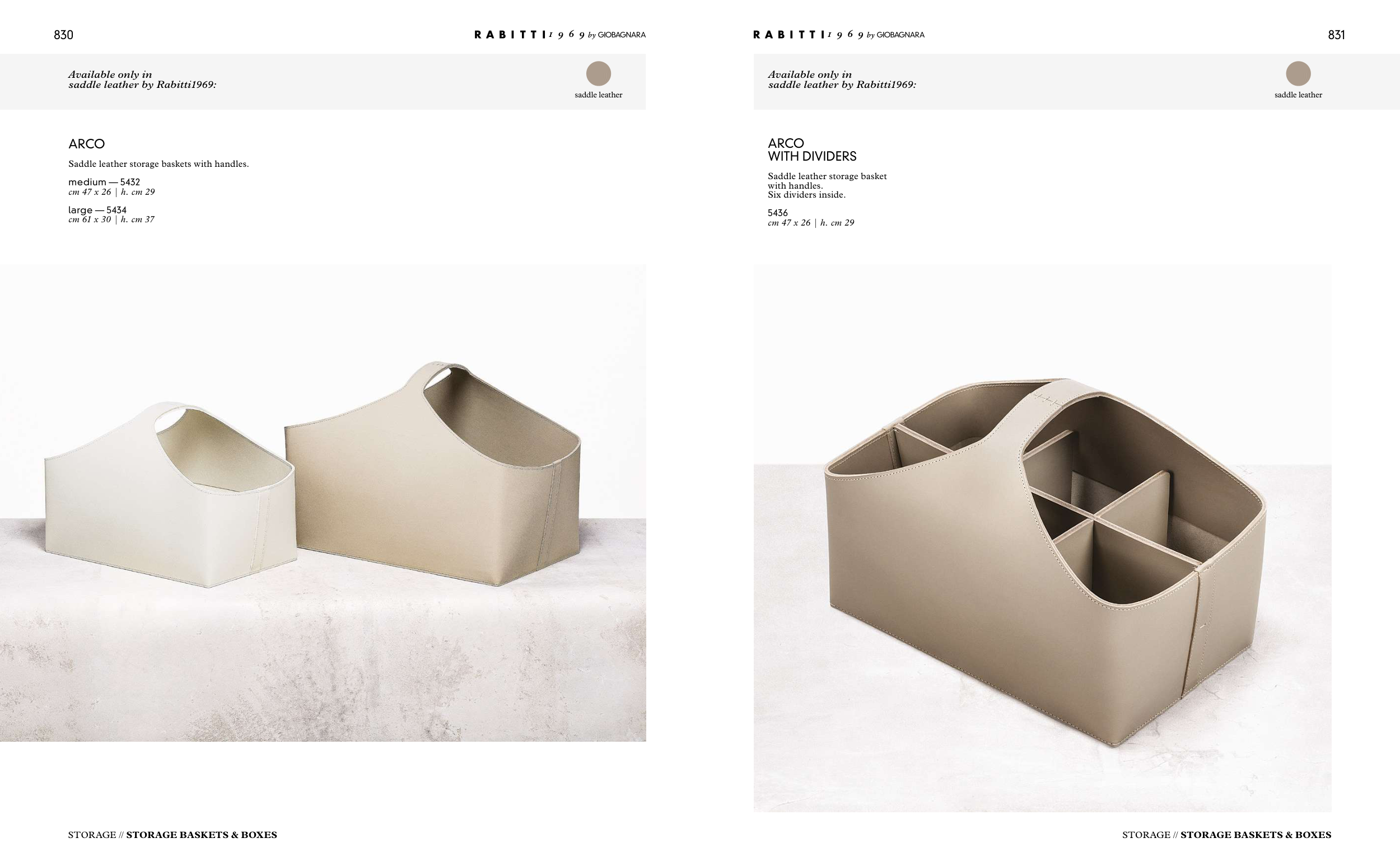 Saddle leather storage baskets with handles.