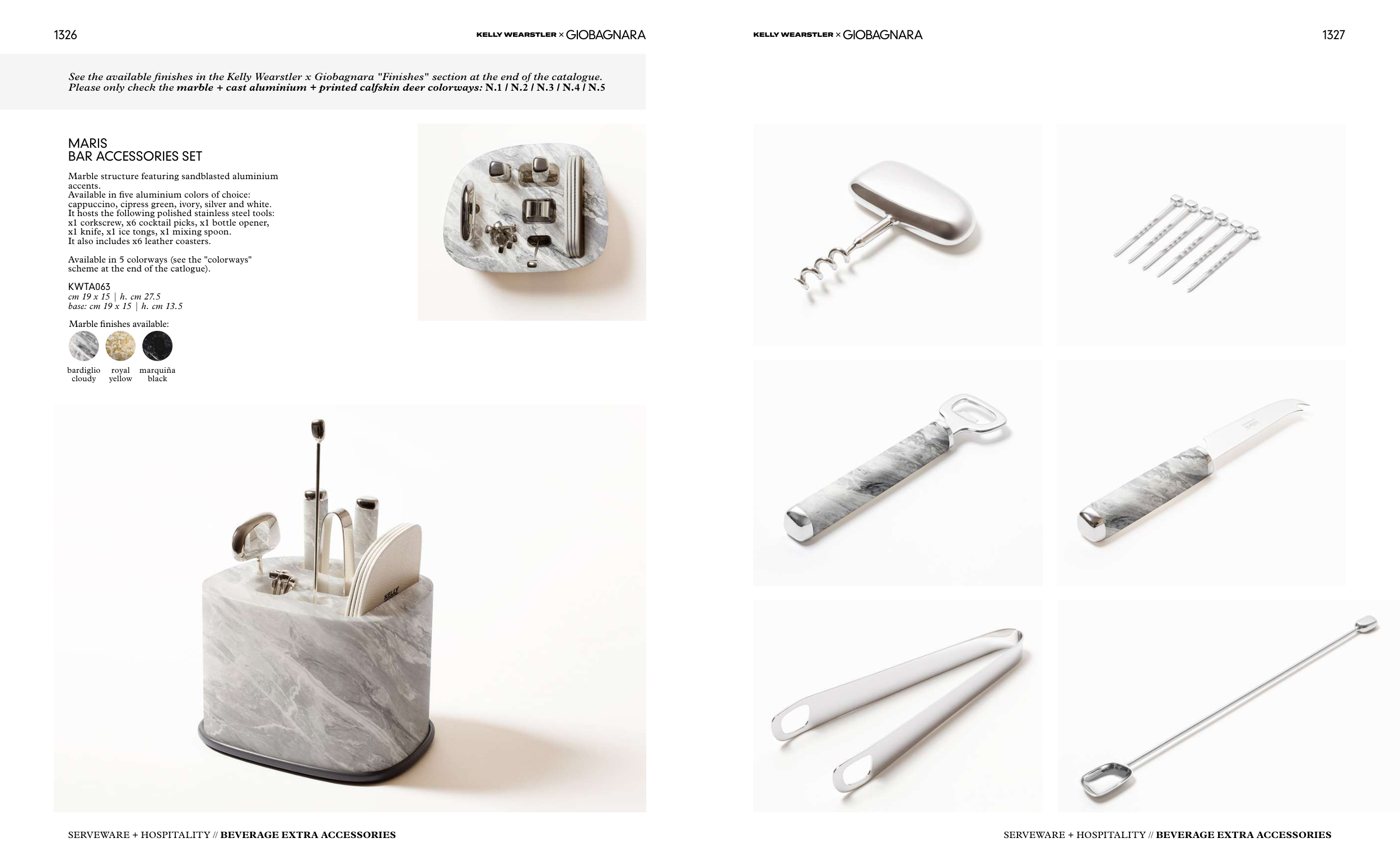 See the available finishes in the Kelly Wearstler x Giobagnara "Finishes" section at the end of the catalogue.