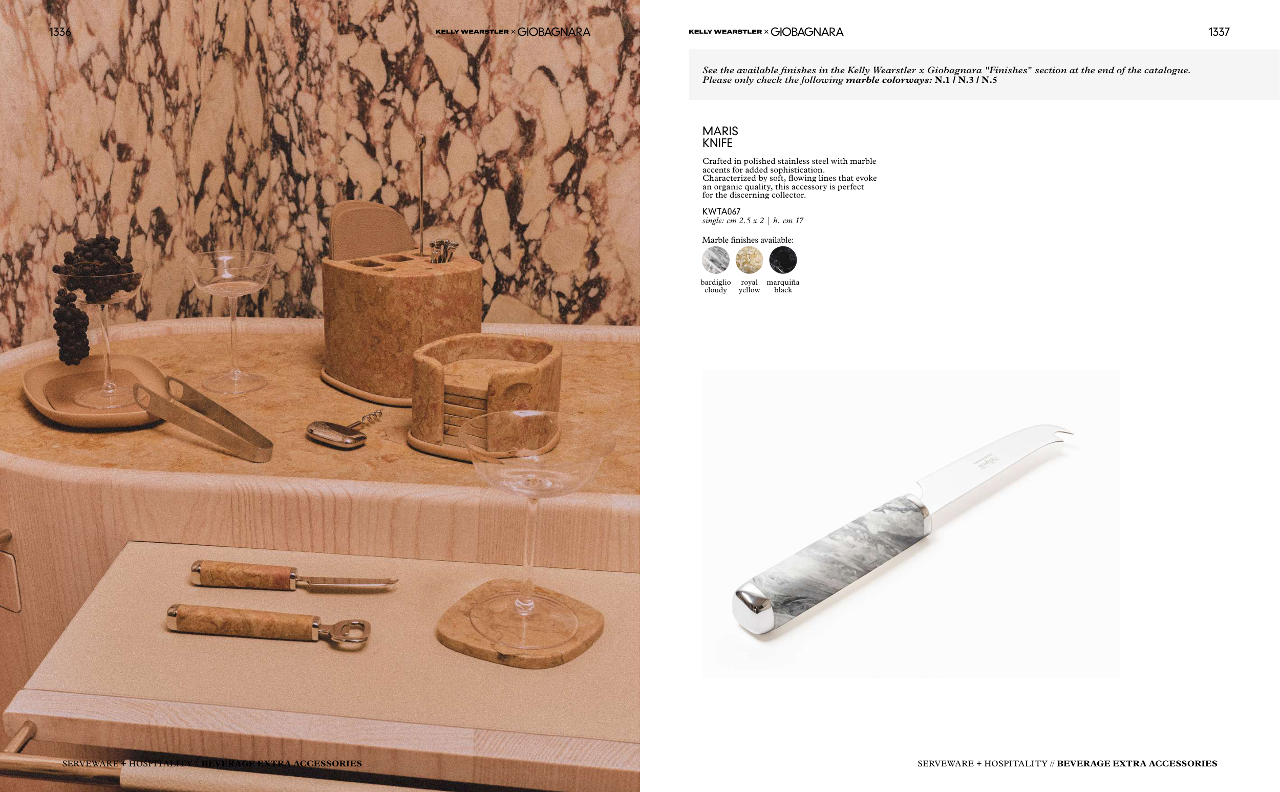 See the available finishes in the Kelly Wearstler x Giobagnara "Finishes" section at the end of the catalogue.