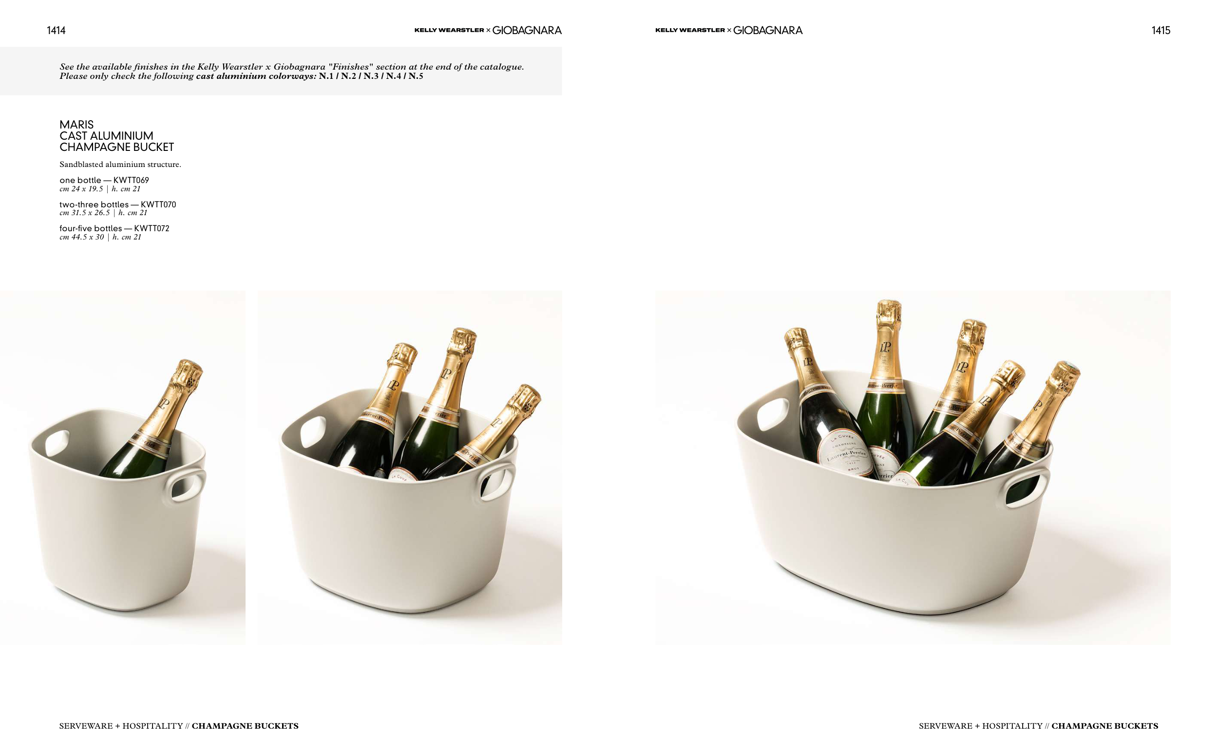See the available finishes in the Kelly Wearstler x Giobagnara "Finishes" section at the end of the catalogue.