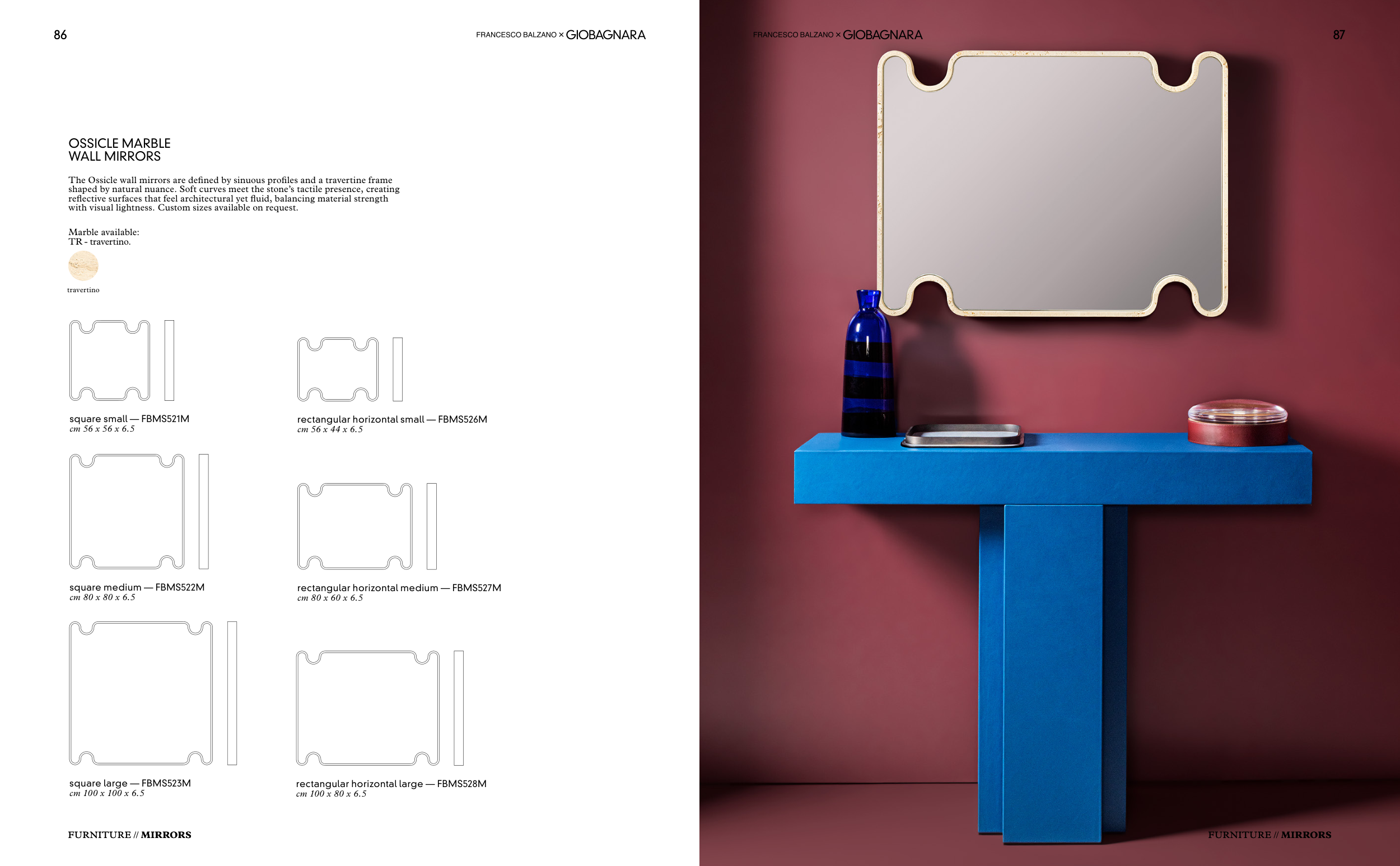 The Ossicle wall mirrors are defined by sinuous profiles and a travertine frame