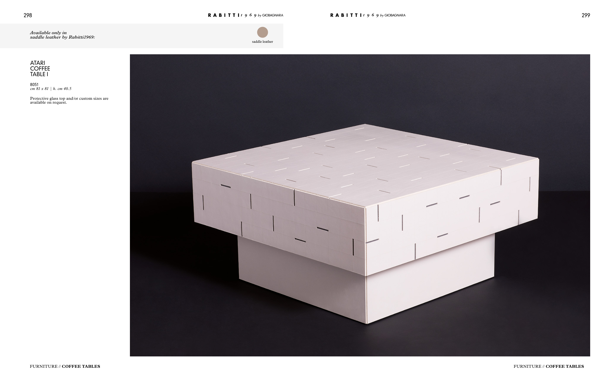 298 299 FURNITURE // COFFEE TABLES ATARI COFFEE TABLE I 8051 cm 81 x 81 | h. cm 40.5 Protective glass top and/or custom sizes are available on request. FURNITURE // COFFEE TABLES Available only in saddle leather by Rabitti1969: saddle leather