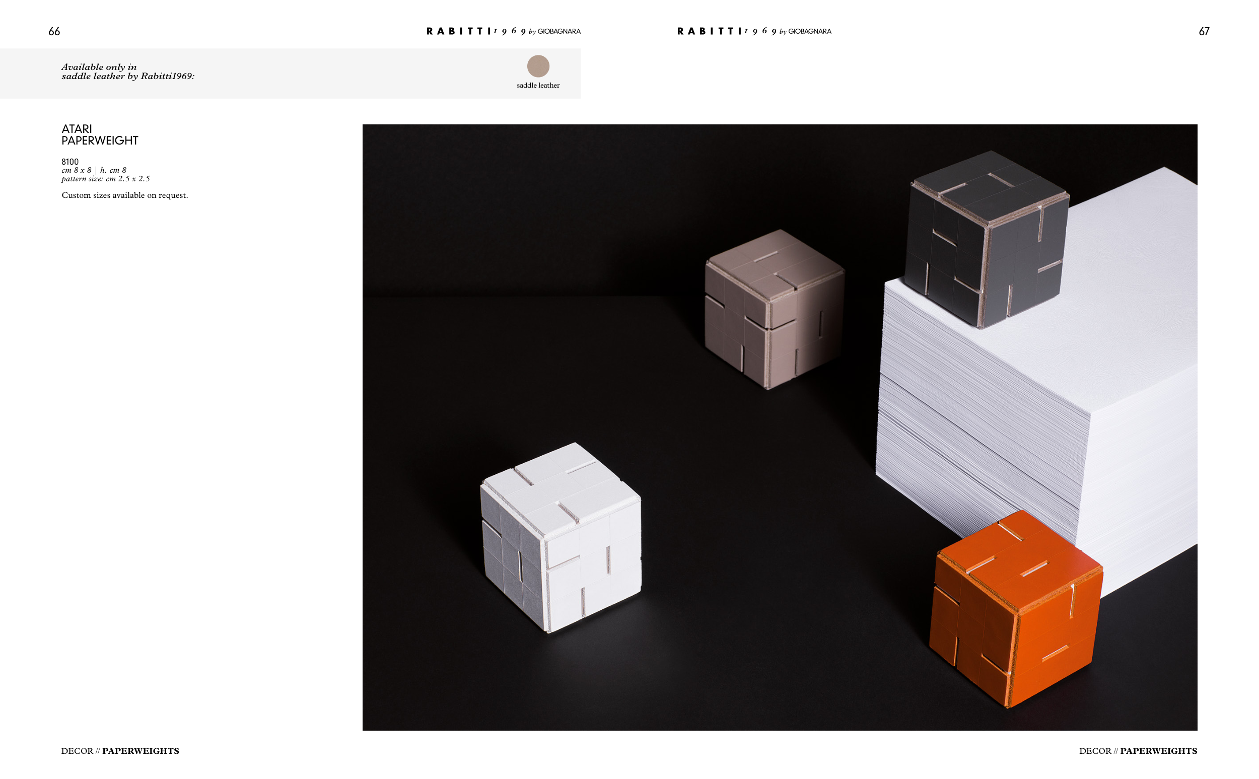 67 66 DECOR // PAPERWEIGHTS ATARI PAPERWEIGHT 8100 cm 8 x 8 | h. cm 8 pattern size: cm 2.5 x 2.5 Custom sizes available on request. DECOR // PAPERWEIGHTS Available only in saddle leather by Rabitti1969: saddle leather