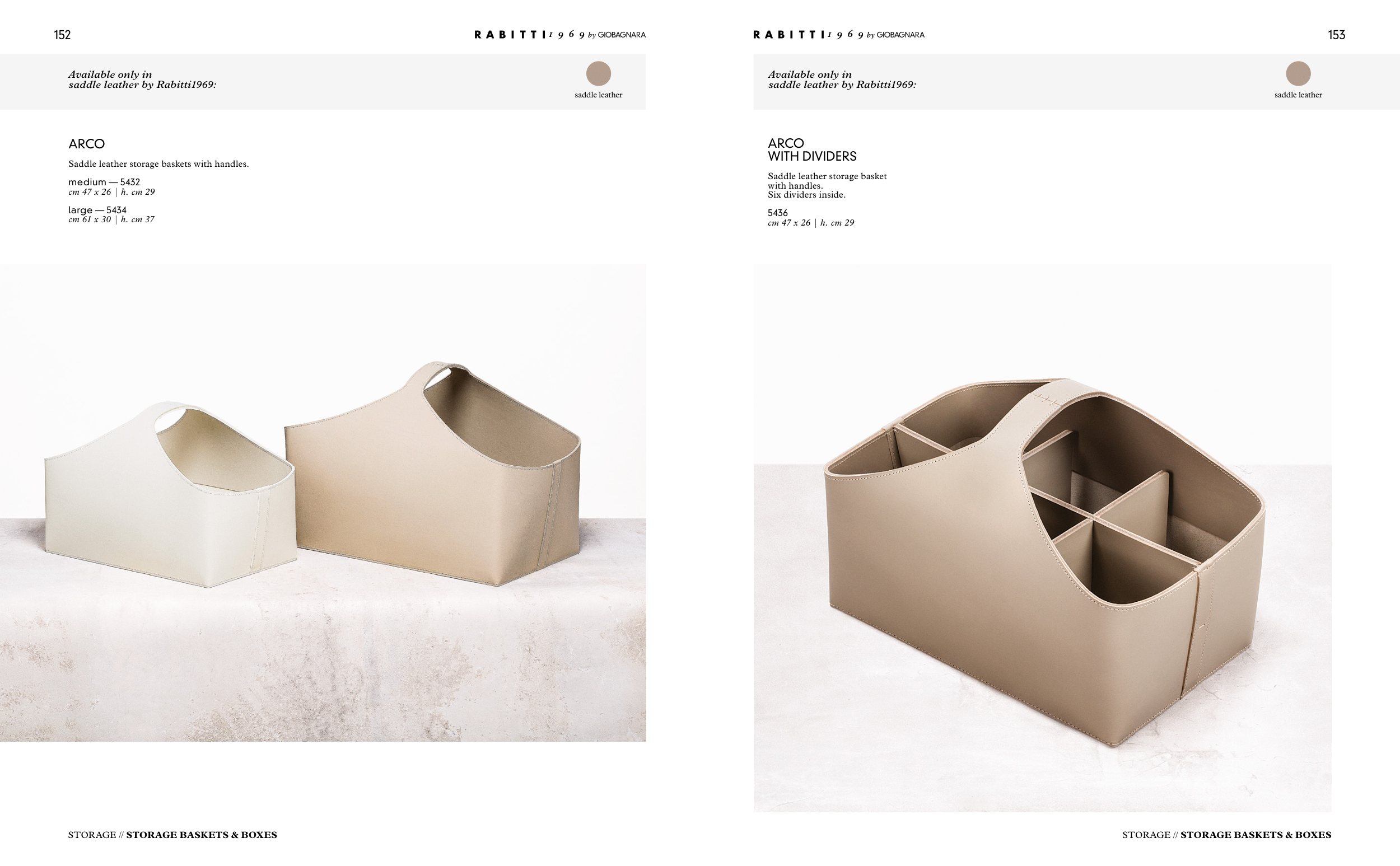 Saddle leather storage baskets with handles.