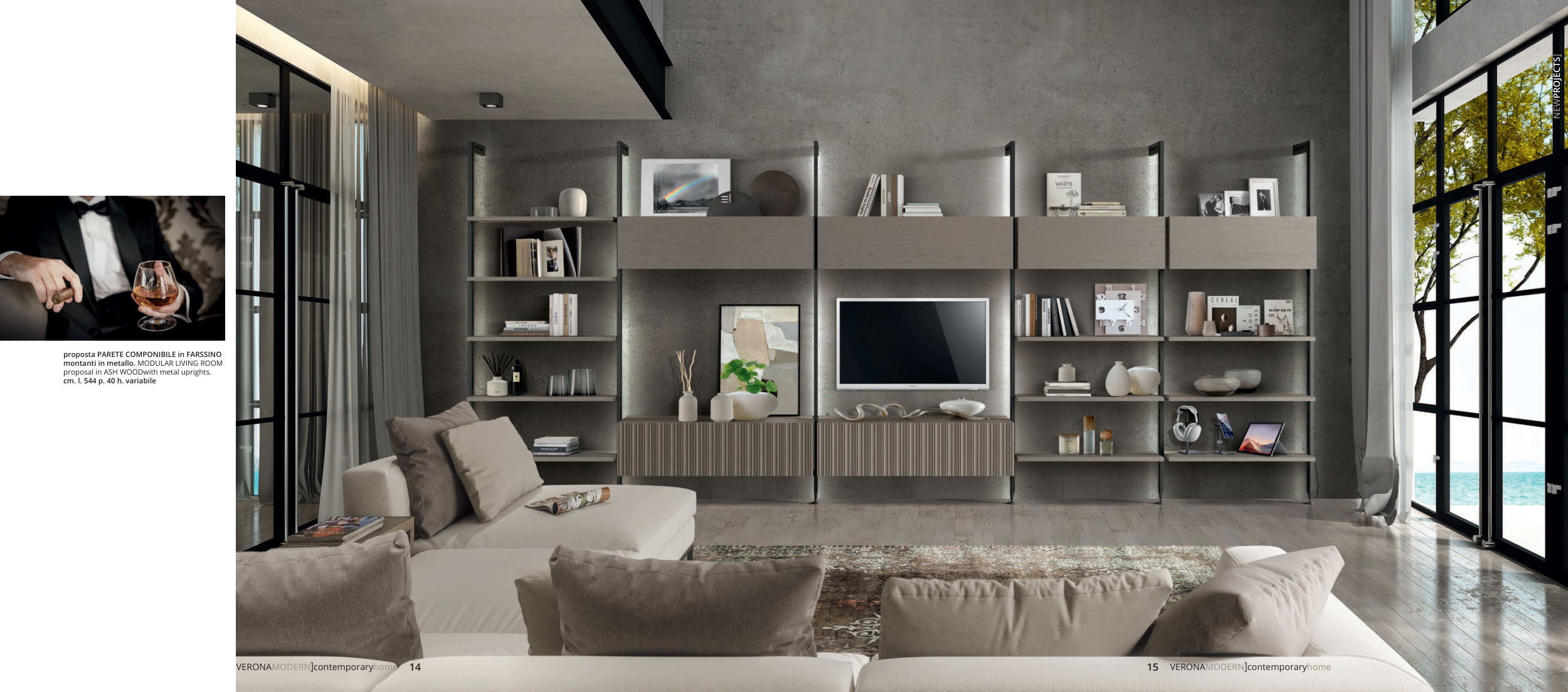 proposta PARETE COMPONIBILE in FARSSINO montanti in metallo. MODULAR LIVING ROOM proposal in ASH WOODwith metal uprights. cm. l. 544 p. 40 h. variabile VERONAMODERN]contemporaryhome VERONAMODERN]contemporaryhome 14 15 NEWPROJECTS]