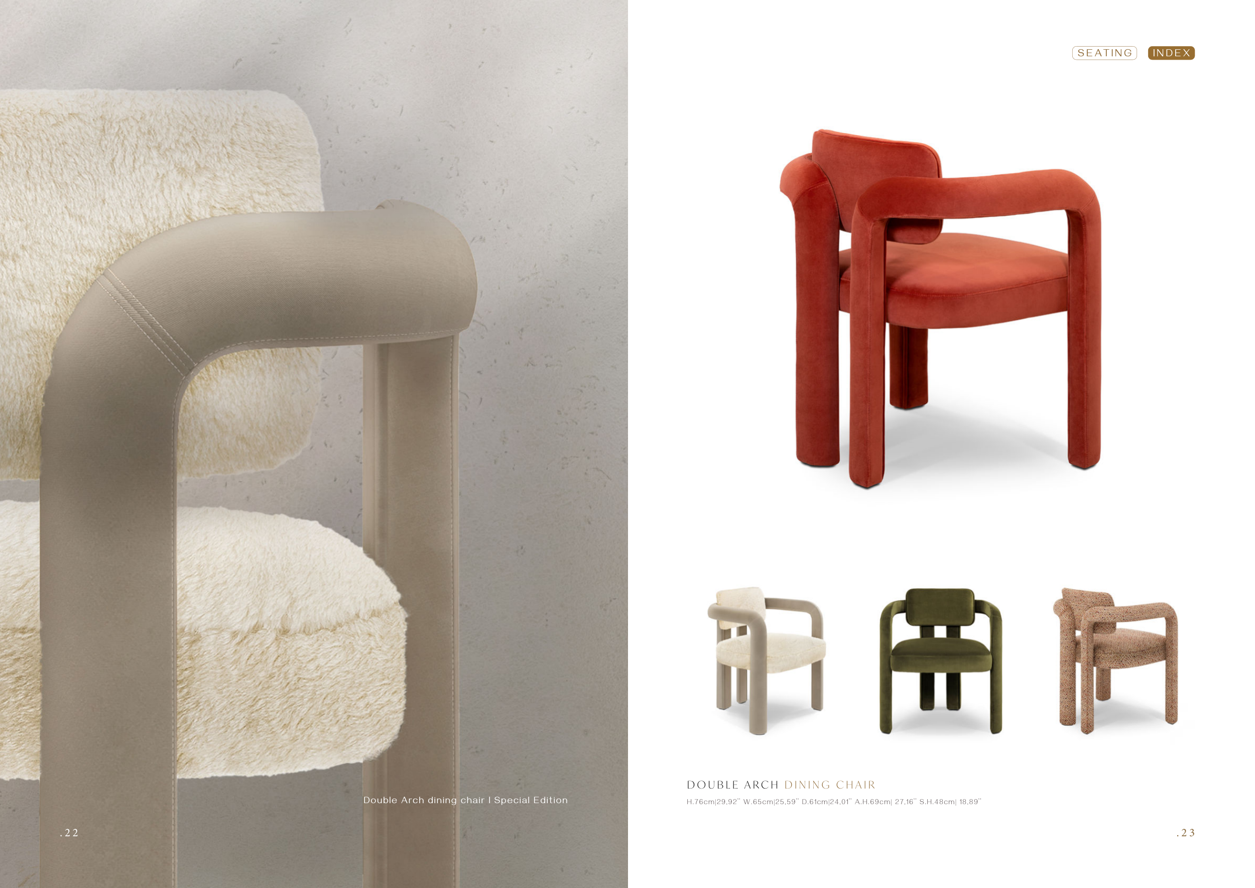 . 2 3 . 2 2 Double Arch dining chair I Special Edition H.76cm|29,92’’ W.65cm|25,59’’ D.61cm|24,01’’ A.H.69cm| 27,16’’ S.H.48cm| 18,89’’ D O U B L E A R C H D I N I N G C H A I R . 2 2 I N D E X S E AT I N G