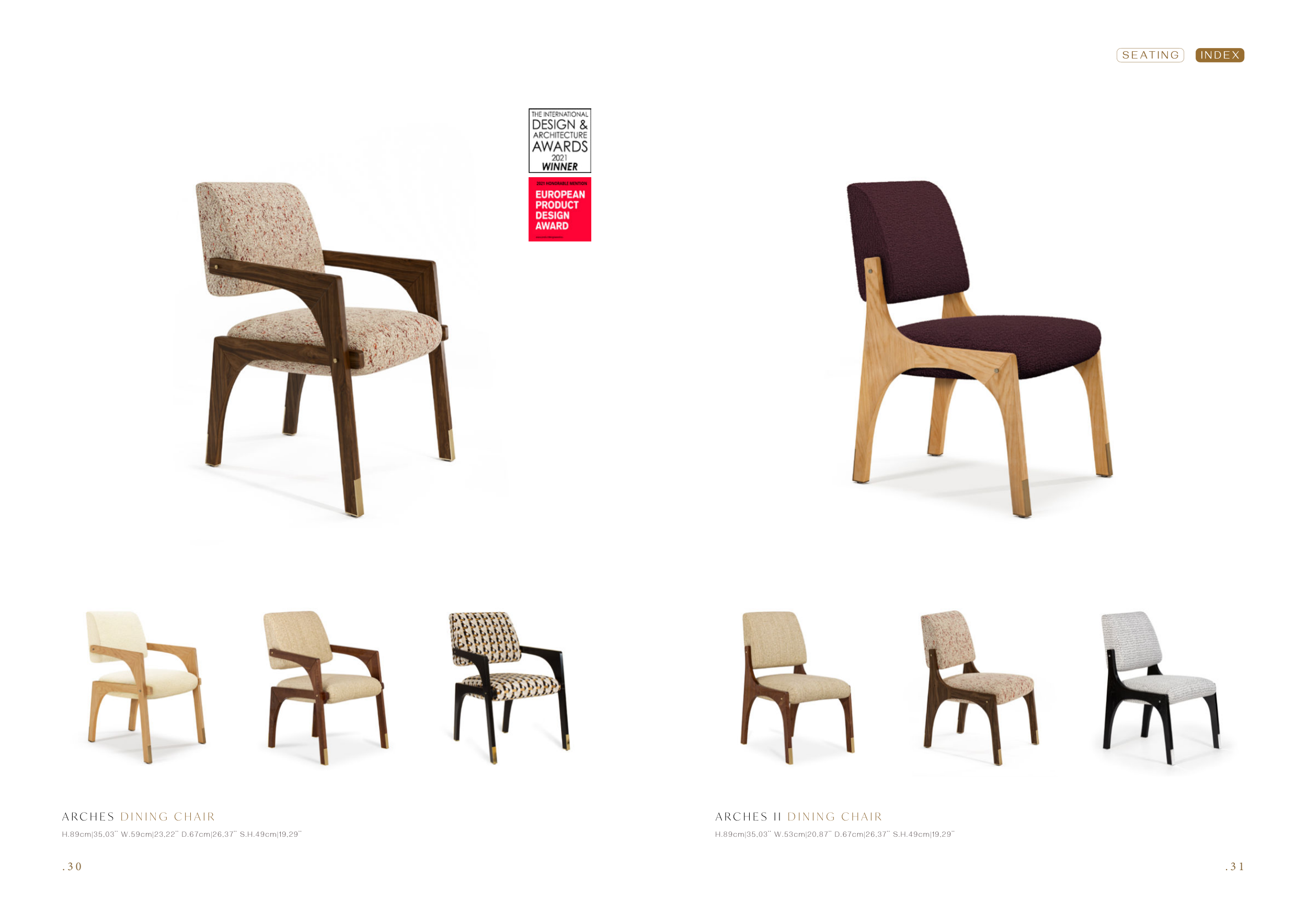 . 3 1 . 3 0 H.89cm|35,03’’ W.59cm|23,22’’ D.67cm|26,37’’ S.H.49cm|19,29’’ H.89cm|35,03’’ W.53cm|20,87’’ D.67cm|26,37’’ S.H.49cm|19,29’’ A R C H E S D I N I N G C H A I R A R C H E S I I D I N I N G C H A I R I N D E X S E AT I N G