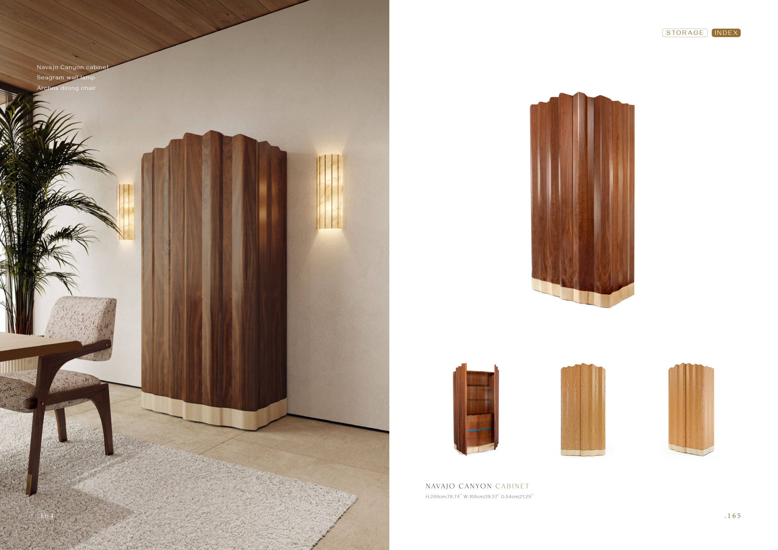. 1 6 5 . 1 6 4 H.200cm|78,74’’ W.100cm|39,37’’ D.54cm|21,25’’ N AVA J O C A N Y O N C A B I N E T Navajo Canyon cabinet Seagram wall lamp Arches dining chair . 1 6 4 I N D E X S TO R A G E