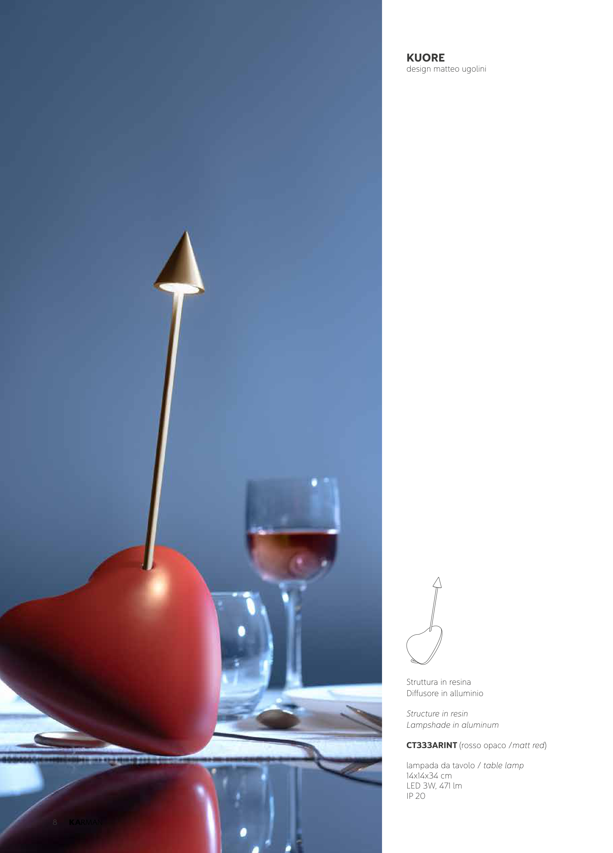 8 KUORE design matteo ugolini Struttura in resina Diffusore in alluminio Structure in resin Lampshade in aluminum CT333ARINT (rosso opaco /matt red) lampada da tavolo / table lamp 14x14x34 cm LED 3W, 471 lm IP 20