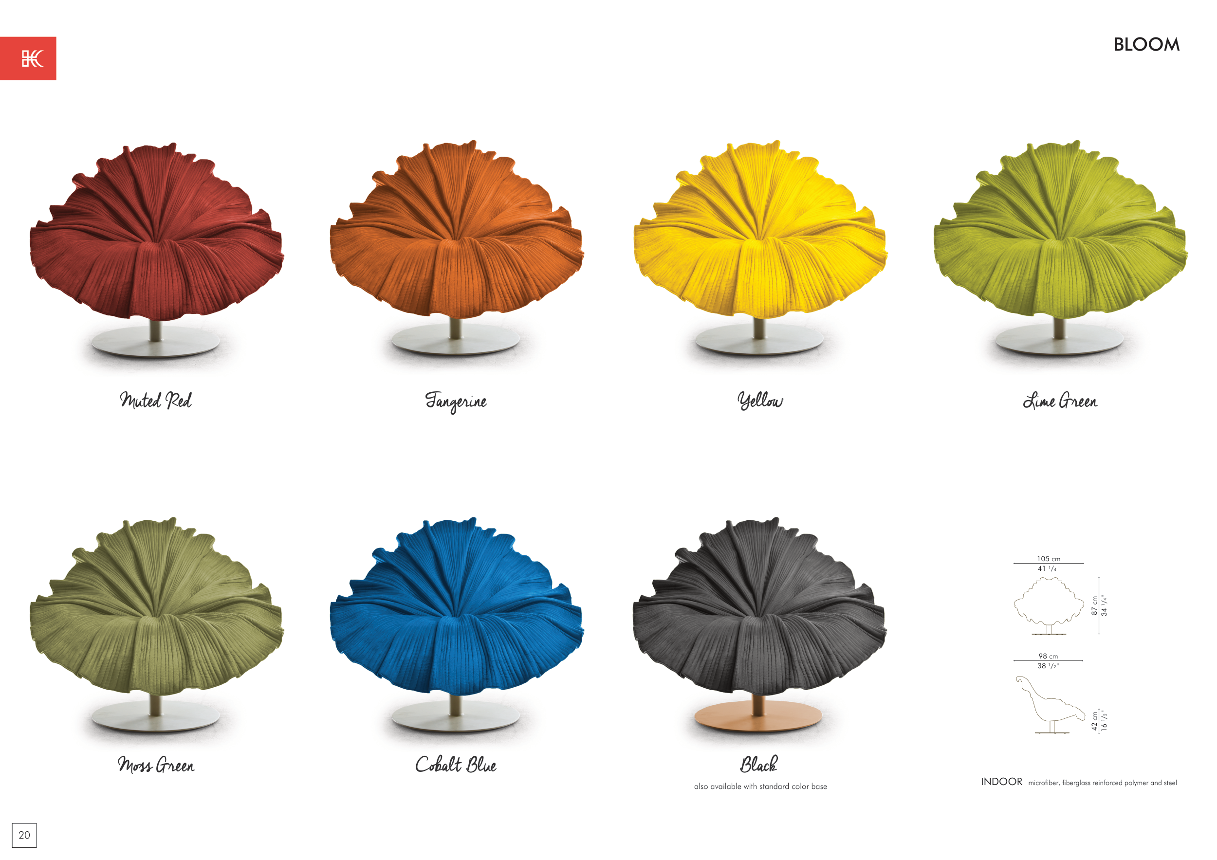 Muted Red Moss Green Cobalt Blue Tangerine 20 BLOOM Black Yellow Lime Green also available with standard color base 105 cm 41 1/4 " 87 cm 34 1/4 " 98 cm 38 1/2 " INDOOR microfiber, fiberglass reinforced polymer and steel 42 cm 16 1/2 "