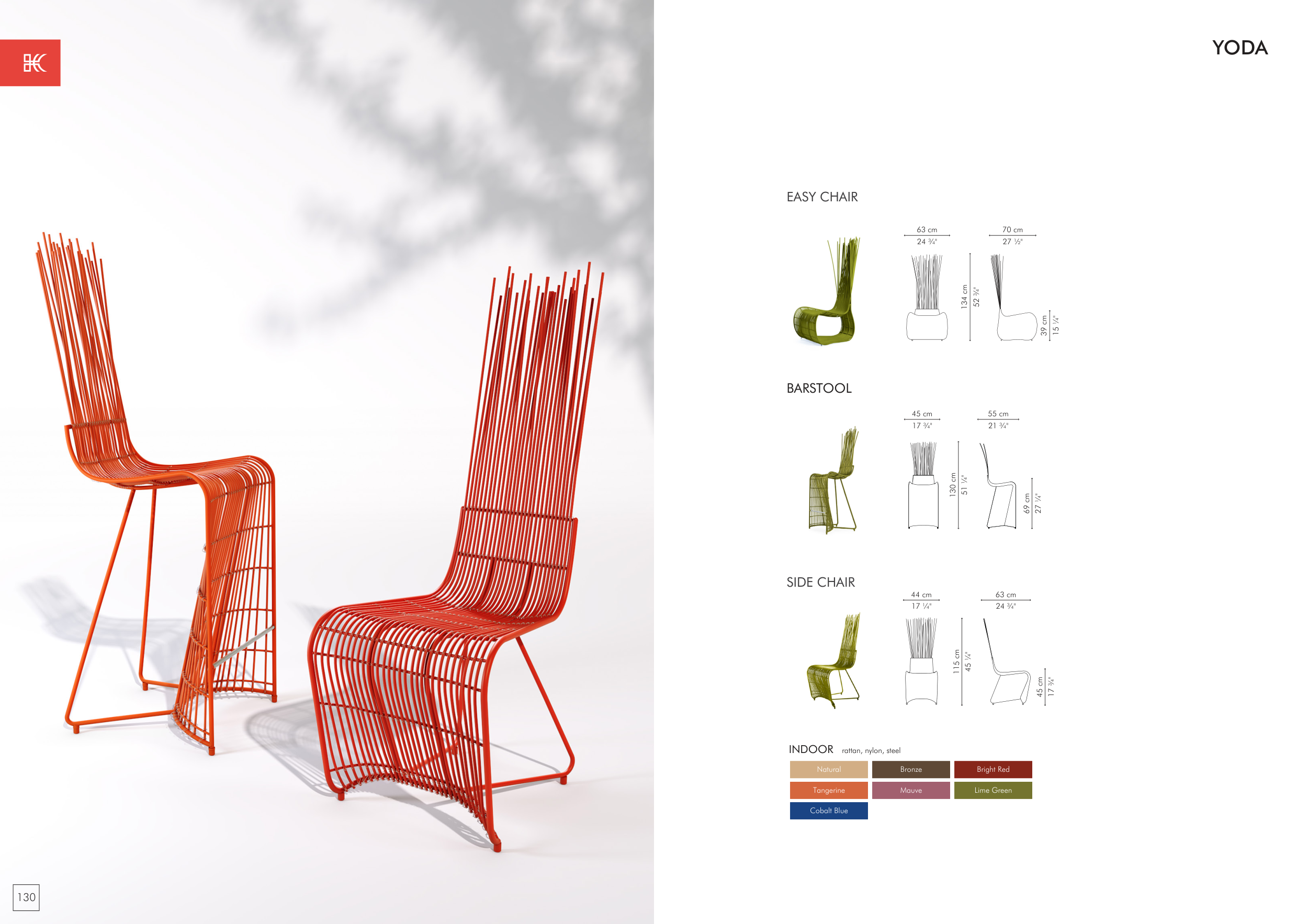 45 cm 17 ¾" 55 cm 21 ¾" 130 cm 51 ¼" 69 cm 27 ¼" BARSTOOL INDOOR rattan, nylon, steel Natural Tangerine Cobalt Blue Mauve Bronze Lime Green Bright Red 44 cm 17 ¼" 63 cm 24 ¾" 115 cm 45 ¼" 45 cm 17 ¾"