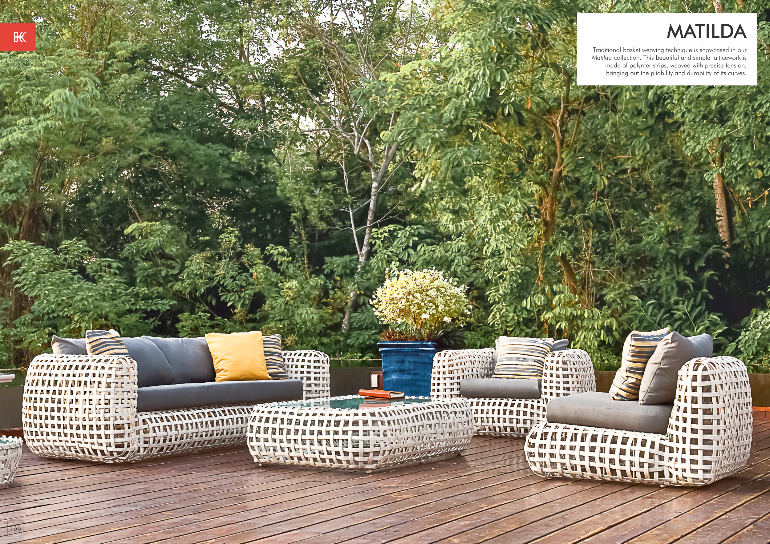 168 MATILDA Traditional basket weaving technique is showcased in our Matilda collection. This beautiful and simple latticework is made of polymer strips, weaved with precise tension, bringing out the pliability and durability of its curves.