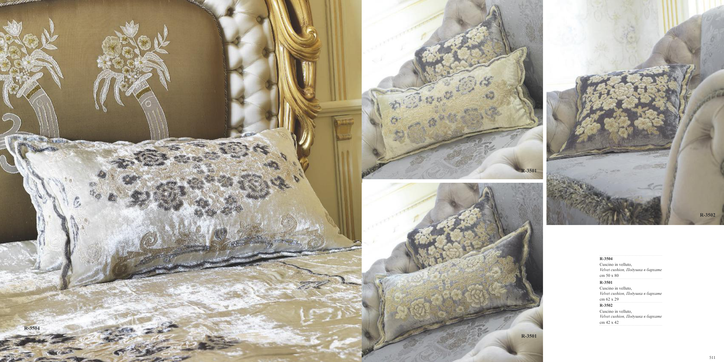 510 511 R-3504 R-3501 R-3501 R-3502 R-3504 Cuscino in velluto, Velvet cushion, Подушка в бархате cm 50 x 80 R-3501 Cuscino in velluto, Velvet cushion, Подушка в бархате cm 62 x 29 R-3502 Cuscino in velluto, Velvet cushion, Подушка в бархате cm 42 x 42