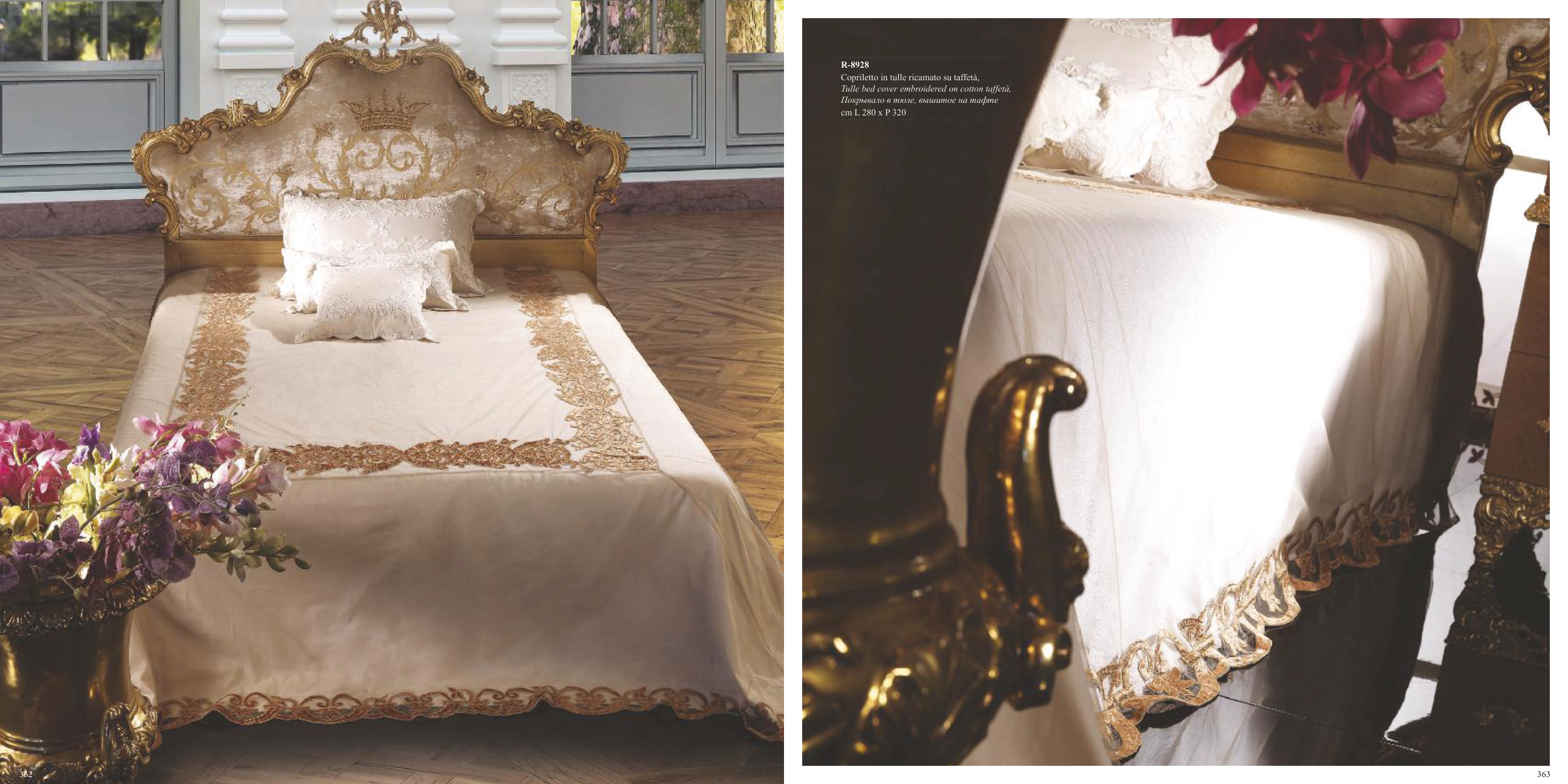 R-8928 Copriletto in tulle ricamato su taffetà, Tulle bed cover embroidered on cotton taffetà, Покрывало в тюле, вышитое на тафте cm L 280 x P 320 362 363