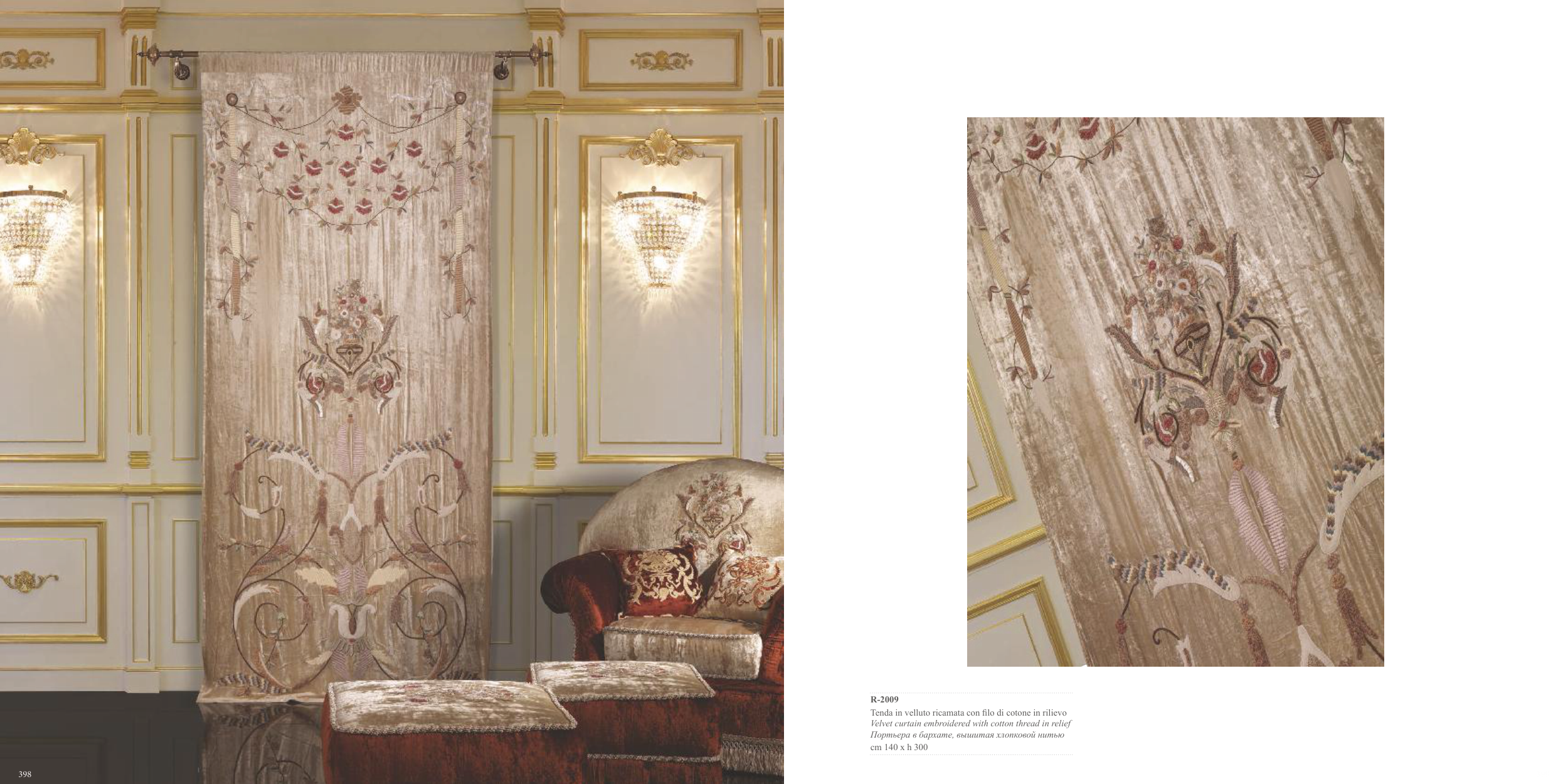 398 399 R-2009 Tenda in velluto ricamata con filo di cotone in rilievo Velvet curtain embroidered with cotton thread in relief Портьера в бархате, вышитая хлопковой нитью cm 140 x h 300