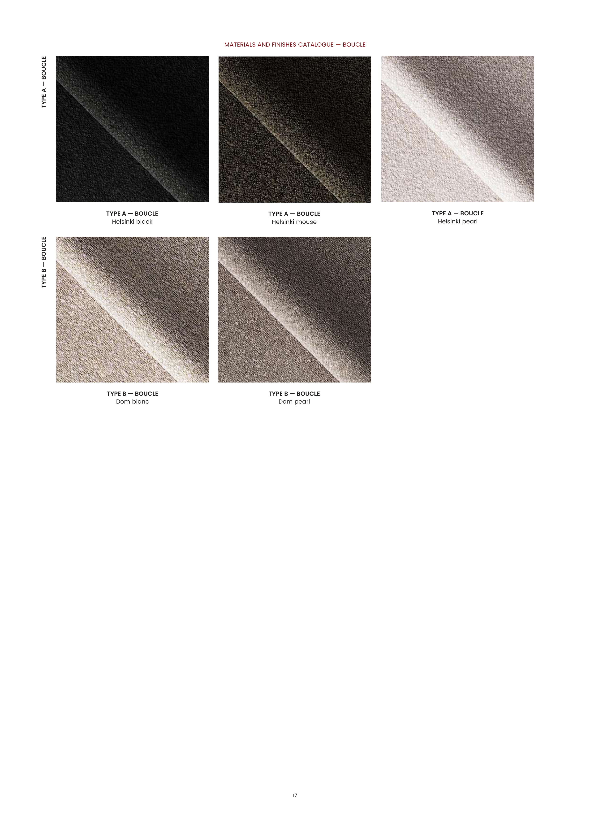 MATERIALS AND FINISHES CATALOGUE — BOUCLE TYPE A — BOUCLE TYPE A — BOUCLE Helsinki black TYPE A — BOUCLE Helsinki mouse TYPE A — BOUCLE Helsinki pearl 17 TYPE B — BOUCLE TYPE B — BOUCLE Dom blanc TYPE B — BOUCLE Dom pearl