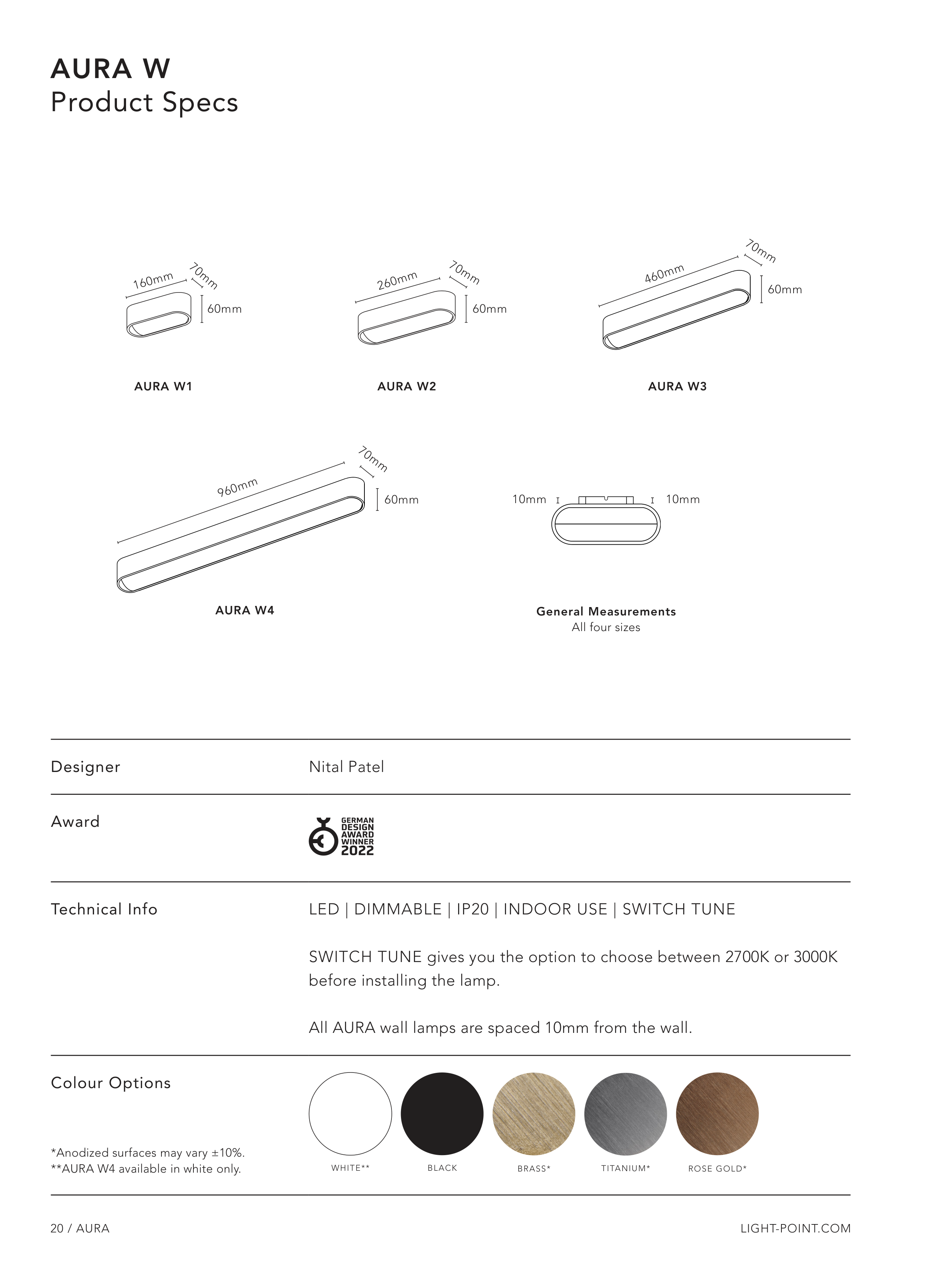 All AURA wall lamps are spaced 10mm from the wall.