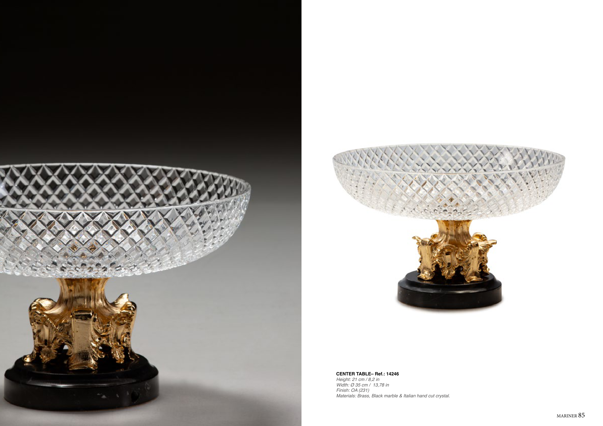 MARINER 85 84 MARINER CENTER TABLE– Ref.: 14246 Height: 21 cm / 8,2 in Width: Ø 35 cm / 13,78 in Finish: OA (231) Materials: Brass, Black marble & Italian hand cut crystal.