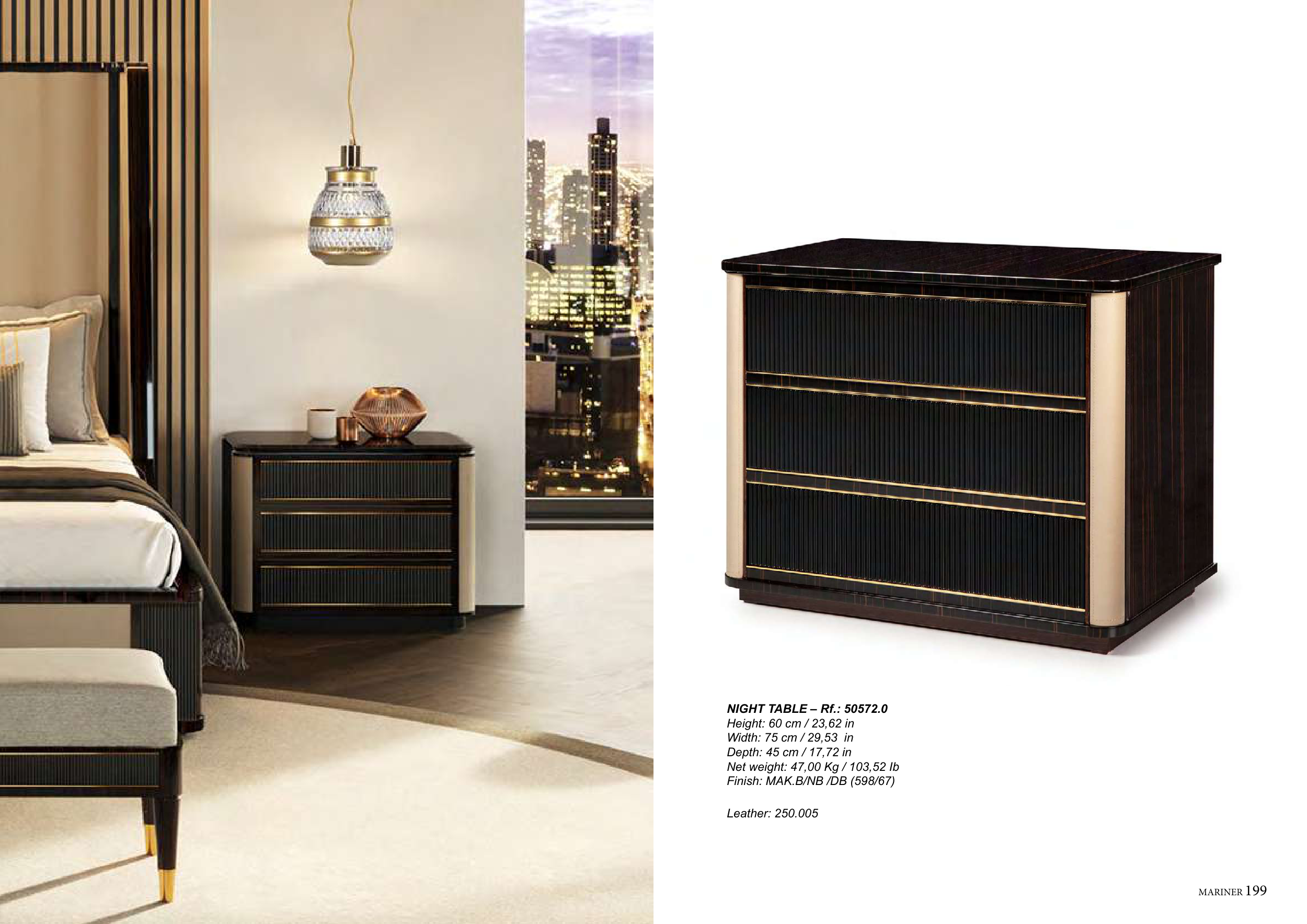 198 MARINER MARINER 199 MONACO COLLECTION Leather: 250.005 NIGHT TABLE – Rf.: 50572.0 Height: 60 cm / 23,62 in Width: 75 cm / 29,53 in Depth: 45 cm / 17,72 in Net weight: 47,00 Kg / 103,52 Ib Finish: MAK.B/NB /DB (598/67)