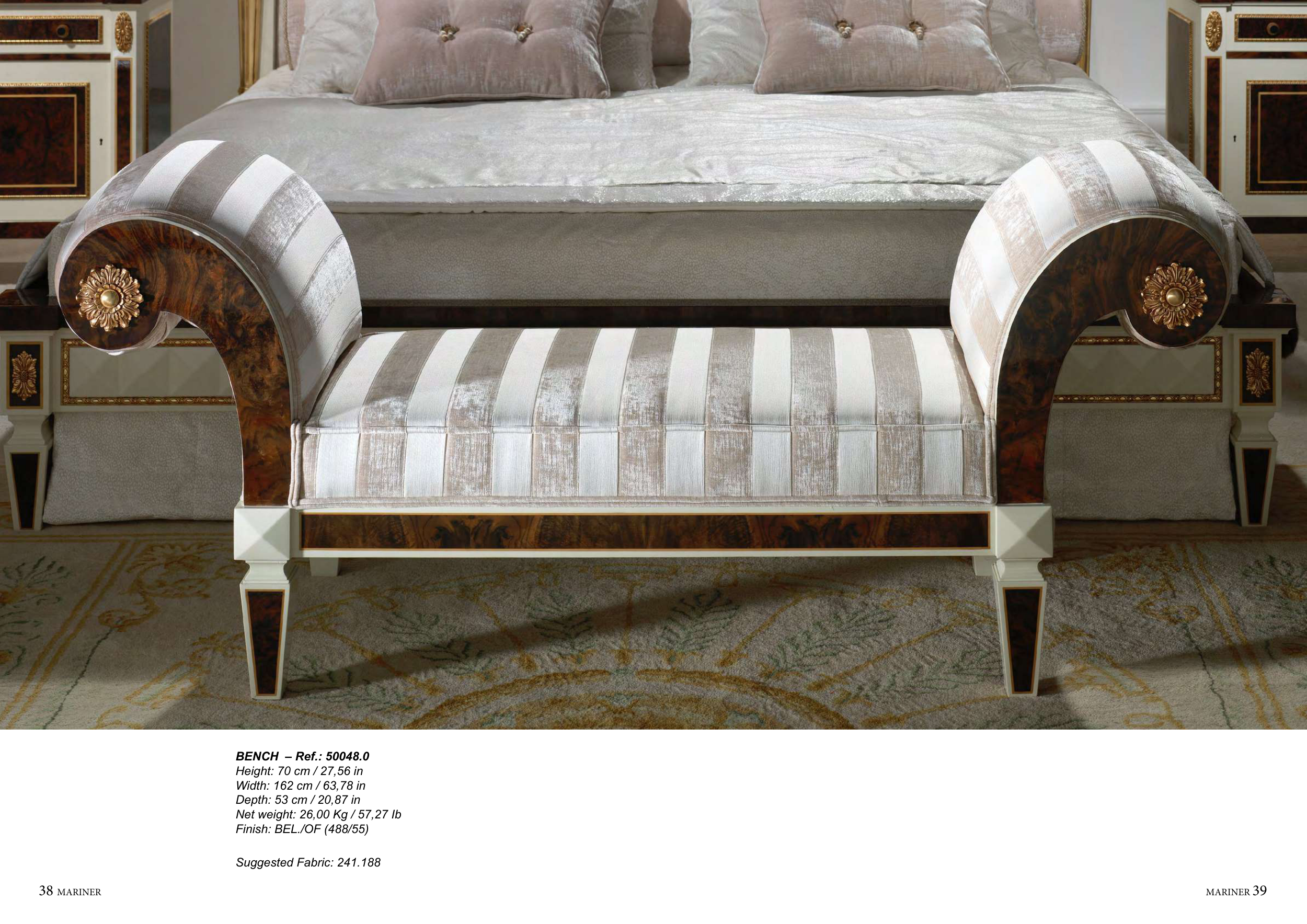 38 MARINER MARINER 39 BENCH – Ref.: 50048.0 Height: 70 cm / 27,56 in Width: 162 cm / 63,78 in Depth: 53 cm / 20,87 in Net weight: 26,00 Kg / 57,27 Ib Finish: BEL./OF (488/55) Suggested Fabric: 241.188