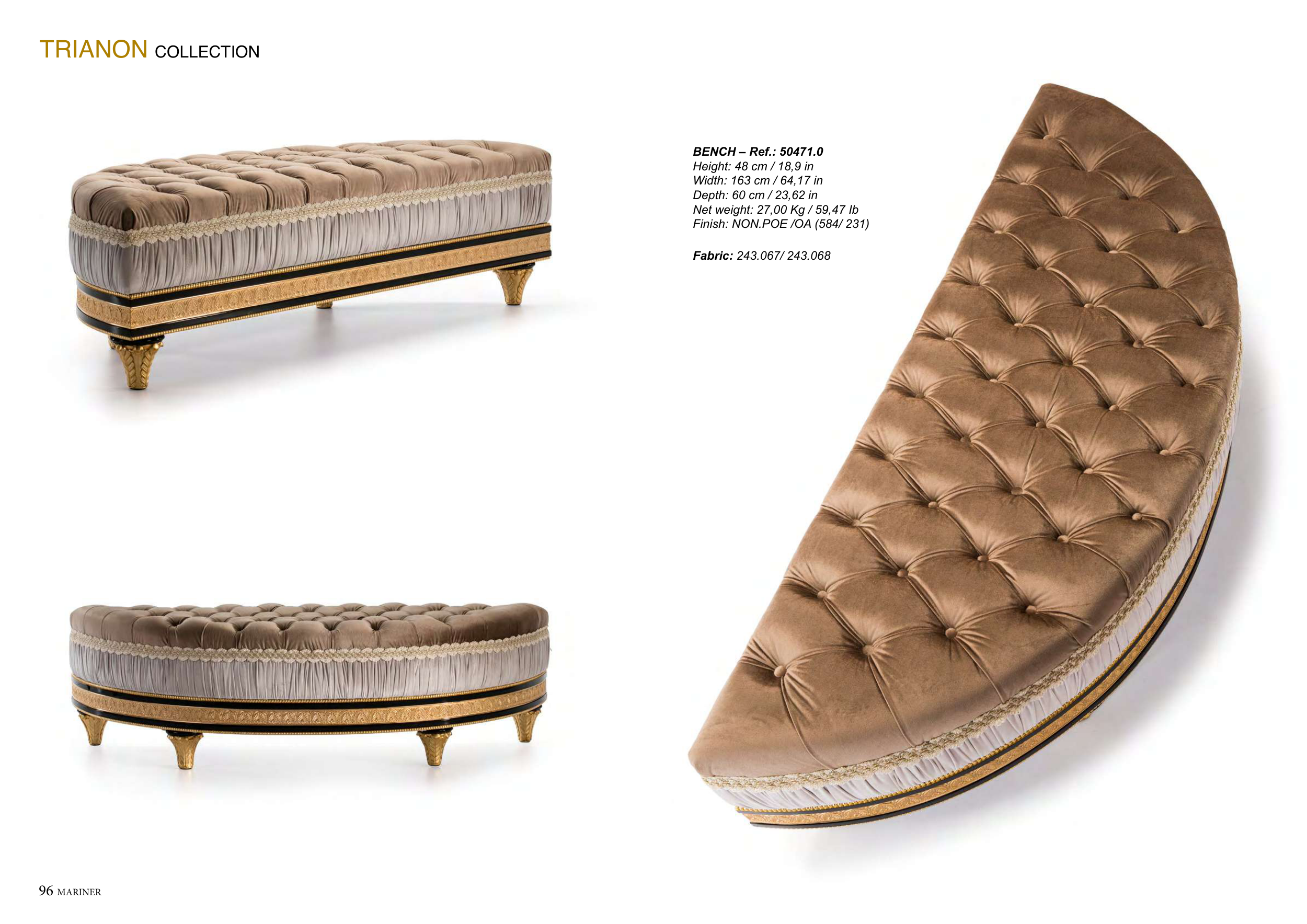 96 MARINER MARINER 97 TRIANON COLLECTION BENCH – Ref.: 50471.0 Height: 48 cm / 18,9 in Width: 163 cm / 64,17 in Depth: 60 cm / 23,62 in Net weight: 27,00 Kg / 59,47 Ib Finish: NON.POE /OA (584/ 231) Fabric: 243.067/ 243.068
