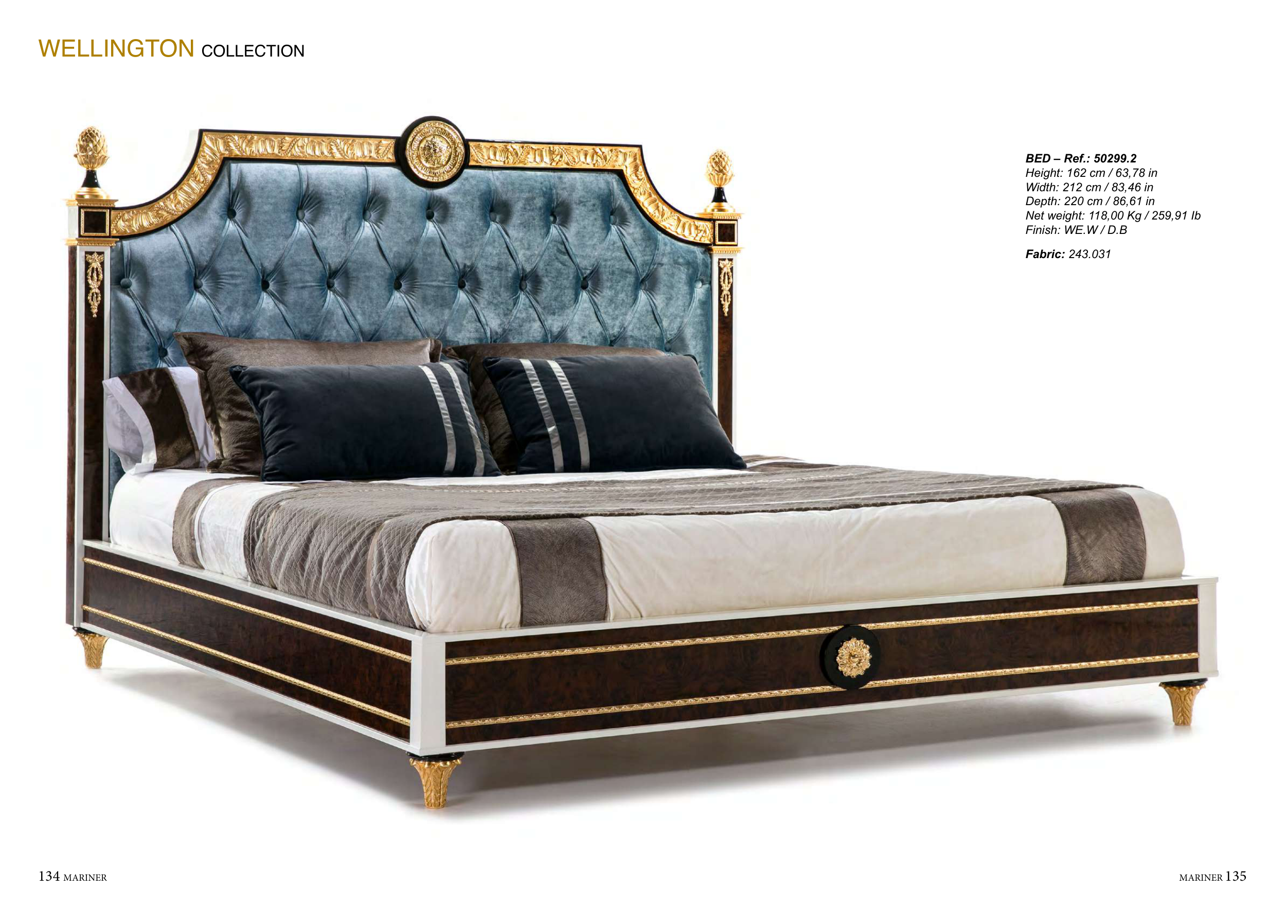 134 MARINER MARINER 135 BED – Ref.: 50299.2 Height: 162 cm / 63,78 in Width: 212 cm / 83,46 in Depth: 220 cm / 86,61 in Net weight: 118,00 Kg / 259,91 Ib Finish: WE.W / D.B Fabric: 243.031 WELLINGTON COLLECTION