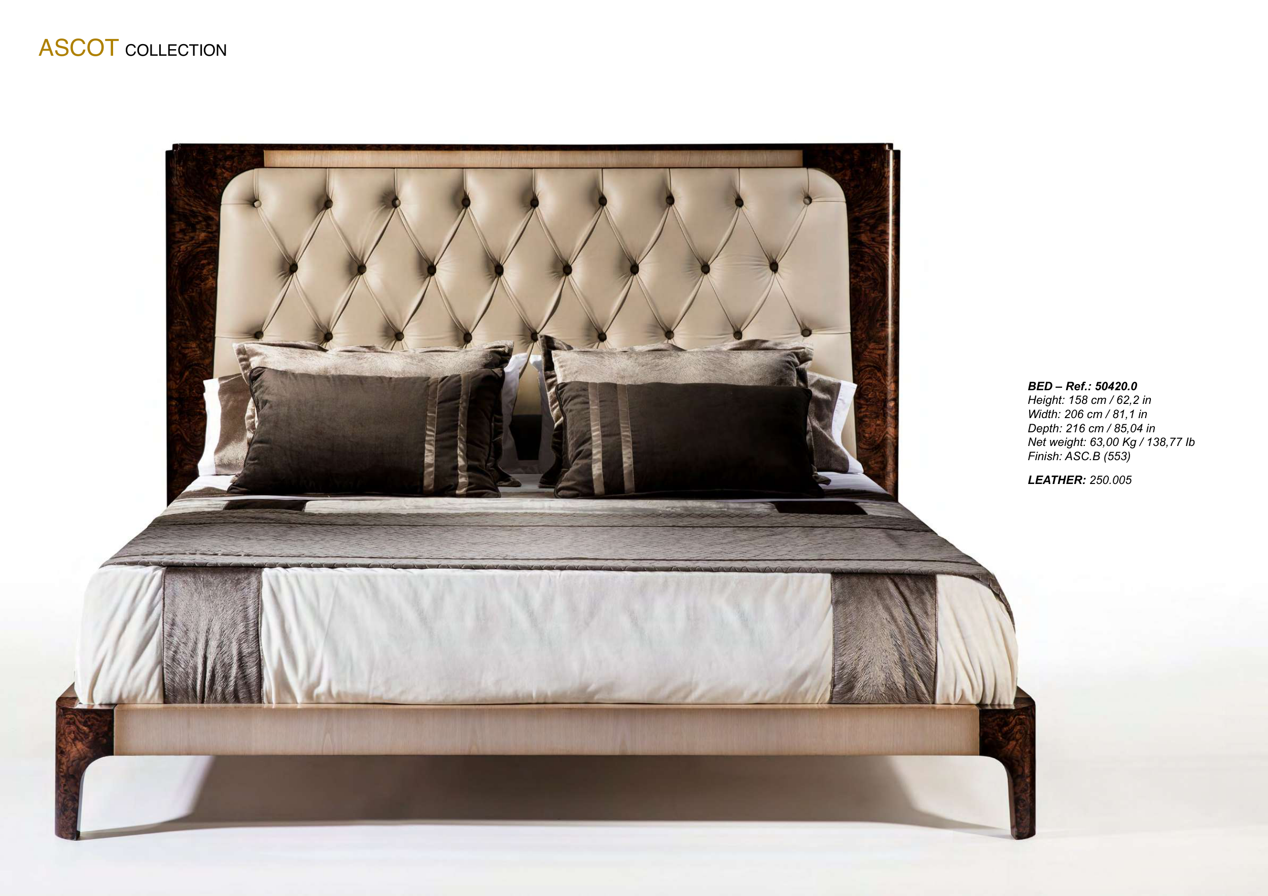 150 MARINER MARINER 151 ASCOT COLLECTION BED – Ref.: 50420.0 Height: 158 cm / 62,2 in Width: 206 cm / 81,1 in Depth: 216 cm / 85,04 in Net weight: 63,00 Kg / 138,77 Ib Finish: ASC.B (553) LEATHER: 250.005