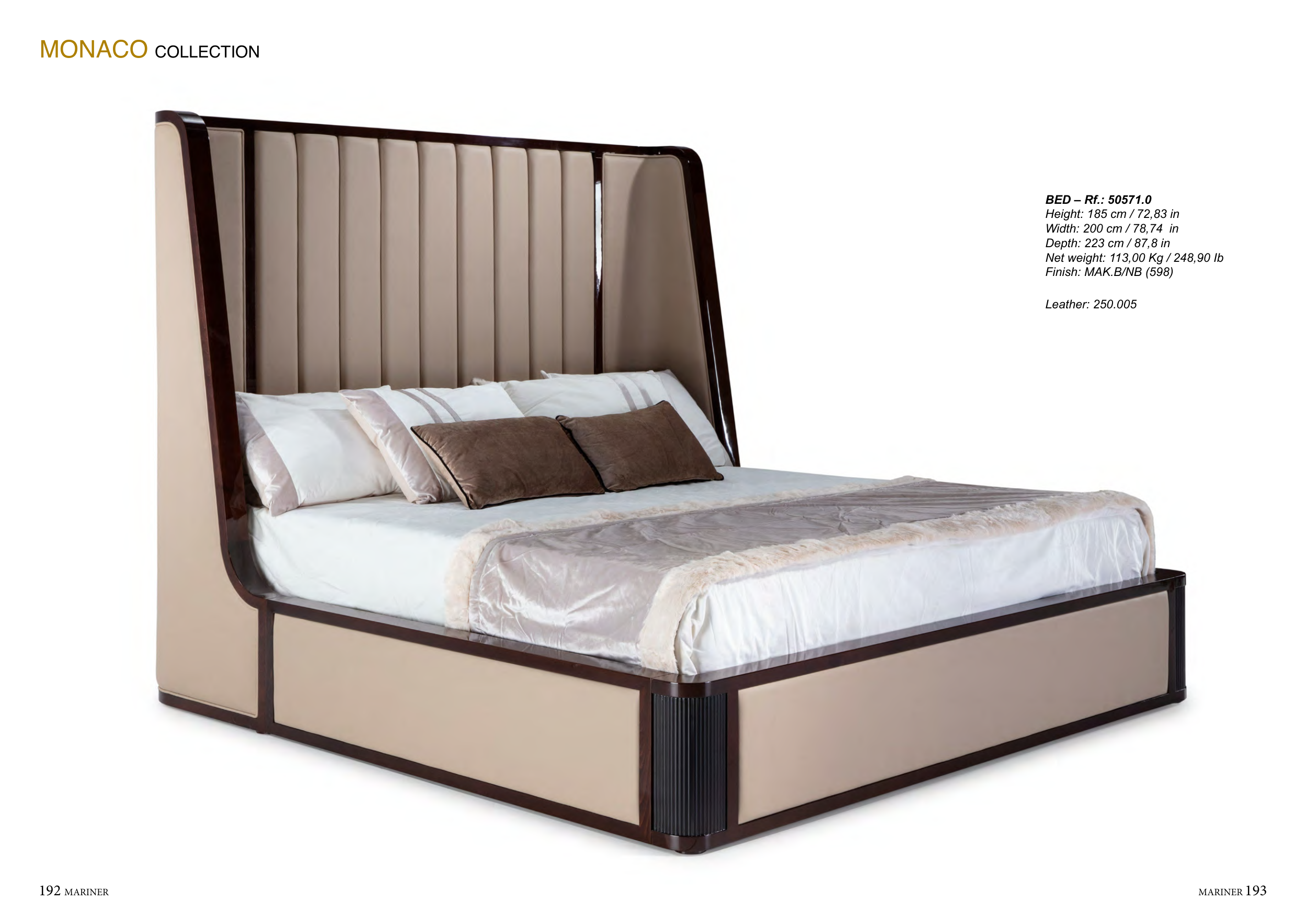 192 MARINER MARINER 193 Leather: 250.005 BED – Rf.: 50571.0 Height: 185 cm / 72,83 in Width: 200 cm / 78,74 in Depth: 223 cm / 87,8 in Net weight: 113,00 Kg / 248,90 Ib Finish: MAK.B/NB (598) MONACO COLLECTION
