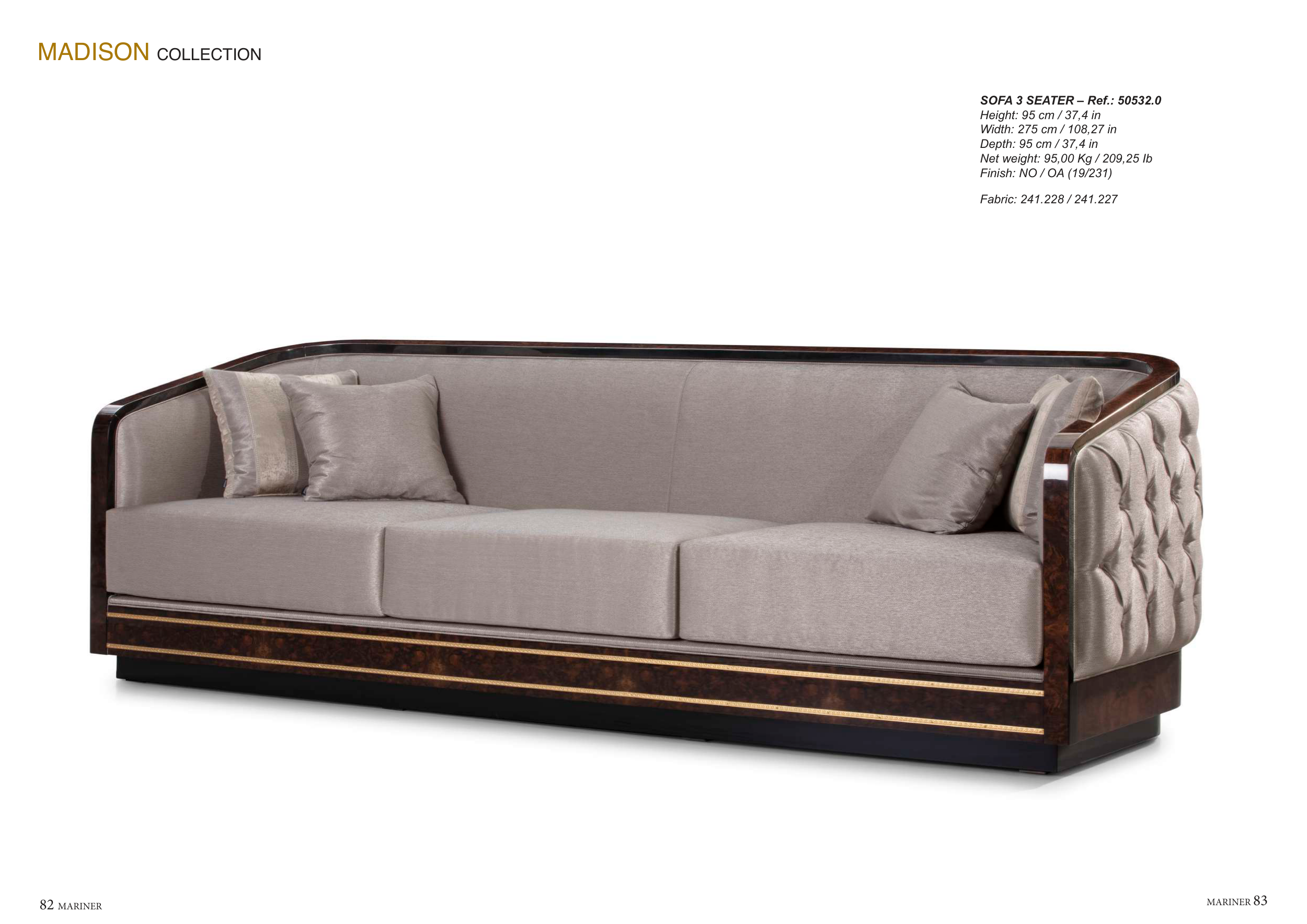MARINER 83 82 MARINER MADISON COLLECTION SOFA 3 SEATER – Ref.: 50532.0 Height: 95 cm / 37,4 in Width: 275 cm / 108,27 in Depth: 95 cm / 37,4 in Net weight: 95,00 Kg / 209,25 Ib Finish: NO / OA (19/231) Fabric: 241.228 / 241.227