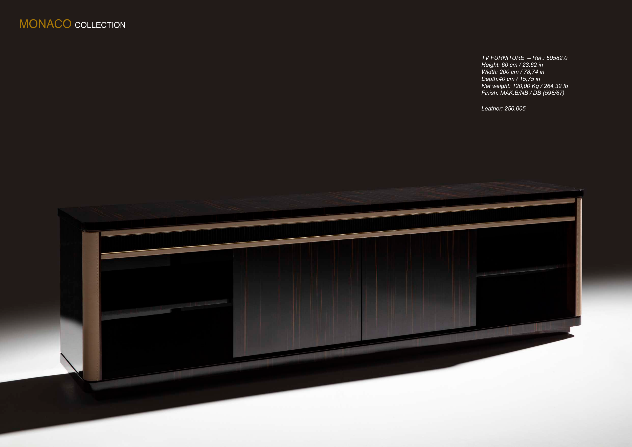 MARINER 131 130 MARINER MONACO COLLECTION Leather: 250.005 TV FURNITURE – Ref.: 50582.0 Height: 60 cm / 23,62 in Width: 200 cm / 78,74 in Depth:40 cm / 15,75 in Net weight: 120,00 Kg / 264,32 Ib Finish: MAK.B/NB / DB (598/67)
